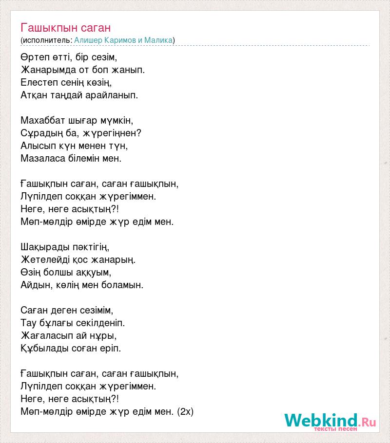 Өртеп өтті, бір сезім, Жанарымда от боп жанып. Елестеп сенің көзің, Атқан таңдай арайланып. Махаббат шығар мүмкін, Сұрадың ба, жүрегіңнен? Алысып күн менен түн, Мазаласа білемін мен. Ғашықпын саған, саған ғашықпын, Лүпілдеп соққан жүрегіммен. Неге, неге асықтың?! Мөп-мөлдір өмірде жүр едім мен. Шақырады пәктігің, Жетелейді қос жанарың. Өзің болшы аққуым, Айдын, көлің мен боламын. Саған деген сезімім, Тау бұлағы секілденіп. Жағаласып ай нұры, Құбылады соған еріп. Ғашықпын саған, саған ғашықпын, Лүпілдеп соққан жүрегіммен. Неге, неге асықтың?! Мөп-мөлдір өмірде жүр едім мен. (2х)