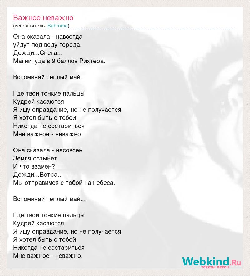 Она сказала - навсегда уйдут под воду города. Дожди...Снега... Магнитуда в 9 баллов Рихтера. Вспоминай теплый май... Где твои тонкие пальцы Кудрей касаются Я ищу оправдание, но не получается. Я хотел быть с тобой Никогда не состариться Мне важное - неважно. Она сказала - насовсем Земля остынет И что взамен? Дожди...Ветра... Мы отправимся с тобой на небеса. Вспоминай теплый май... Где твои тонкие пальцы Кудрей касаются Я ищу оправдание, но не получается. Я хотел быть с тобой Никогда не состариться Мне важное - неважно.