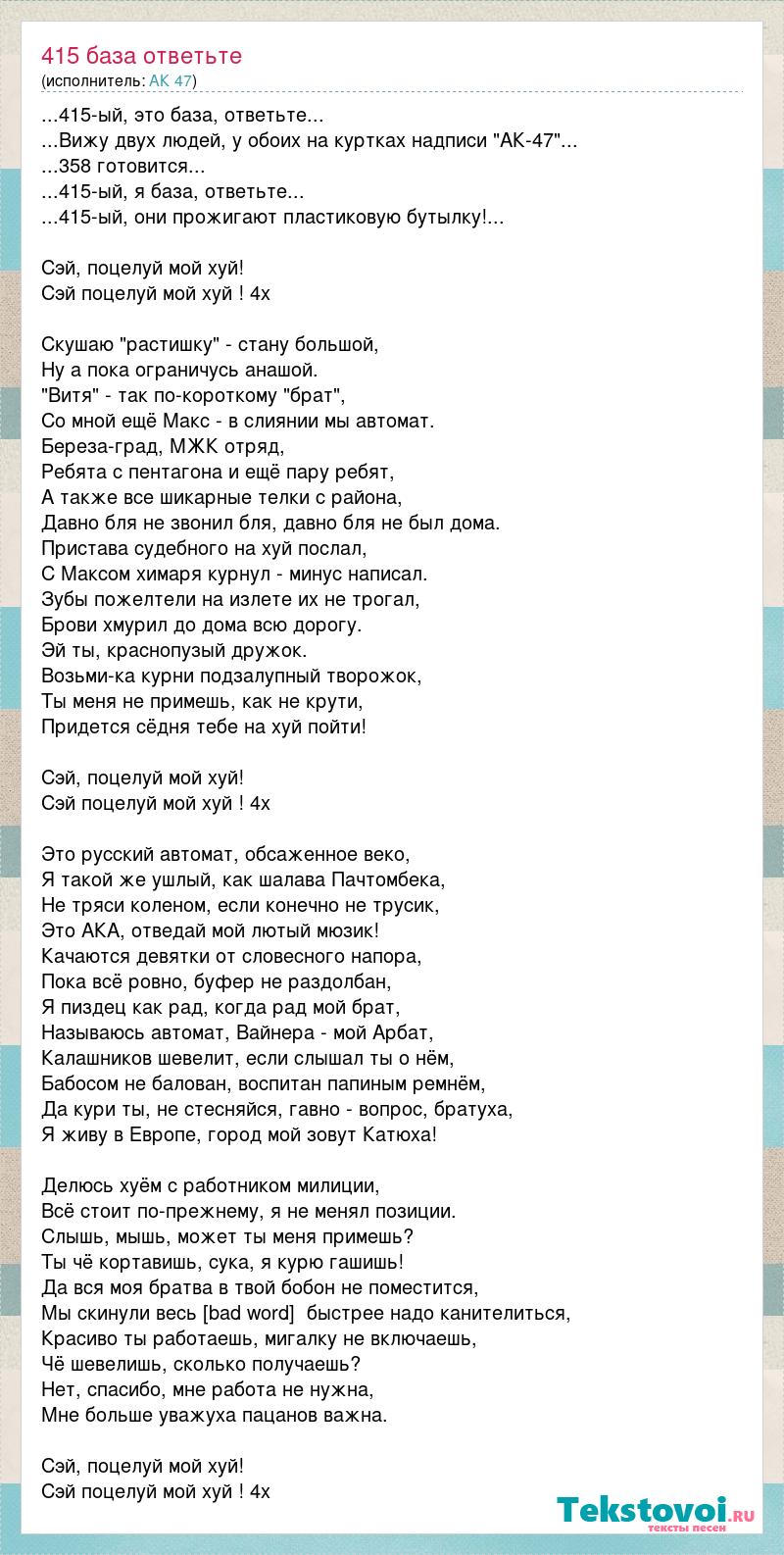 ...415-ый, это база, ответьте... ...Вижу двух людей, у обоих на куртках надписи "АК-47"... ...358 готовится... ...415-ый, я база, ответьте... ...415-ый, они прожигают пластиковую бутылку!... Сэй, поцелуй мой хуй! Сэй поцелуй мой хуй ! 4х Скушаю "растишку" - стану большой, Ну а пока ограничусь анашой. "Витя" - так по-короткому "брат", Со мной ещё Макс - в слиянии мы автомат. Береза-град, МЖК отряд, Ребята с пентагона и ещё пару ребят, А также все шикарные телки с района, Давно бля не звонил бля, давно бля не был дома. Пристава судебного на хуй послал, С Максом химаря курнул - минус написал. Зубы пожелтели на излете их не трогал, Брови хмурил до дома всю дорогу. Эй ты, краснопузый дружок. Возьми-ка курни подзалупный творожок, Ты меня не примешь, как не крути, Придется сёдня тебе на хуй пойти! Сэй, поцелуй мой хуй! Сэй поцелуй мой хуй ! 4х Это русский автомат, обсаженное веко, Я такой же ушлый, как шалава Пачтомбека, Не тряси коленом, если конечно не трусик, Это АКА, отведай мой лютый мюзик! Качаются девятки от словесного напора, Пока всё ровно, буфер не раздолбан, Я пиздец как рад, когда рад мой брат, Называюсь автомат, Вайнера - мой Арбат, Калашников шевелит, если слышал ты о нём, Бабосом не балован, воспитан папиным ремнём, Да кури ты, не стесняйся, гавно - вопрос, братуха, Я живу в Европе, город мой зовут Катюха! Делюсь хуём с работником милиции, Всё стоит по-прежнему, я не менял позиции. Слышь, мышь, может ты меня примешь? Ты чё кортавишь, сука, я курю гашишь! Да вся моя братва в твой бобон не поместится, Мы скинули весь drugs, быстрее надо канителиться, Красиво ты работаешь, мигалку не включаешь, Чё шевелишь, сколько получаешь? Нет, спасибо, мне работа не нужна, Мне больше уважуха пацанов важна. Сэй, поцелуй мой хуй! Сэй поцелуй мой хуй ! 4х