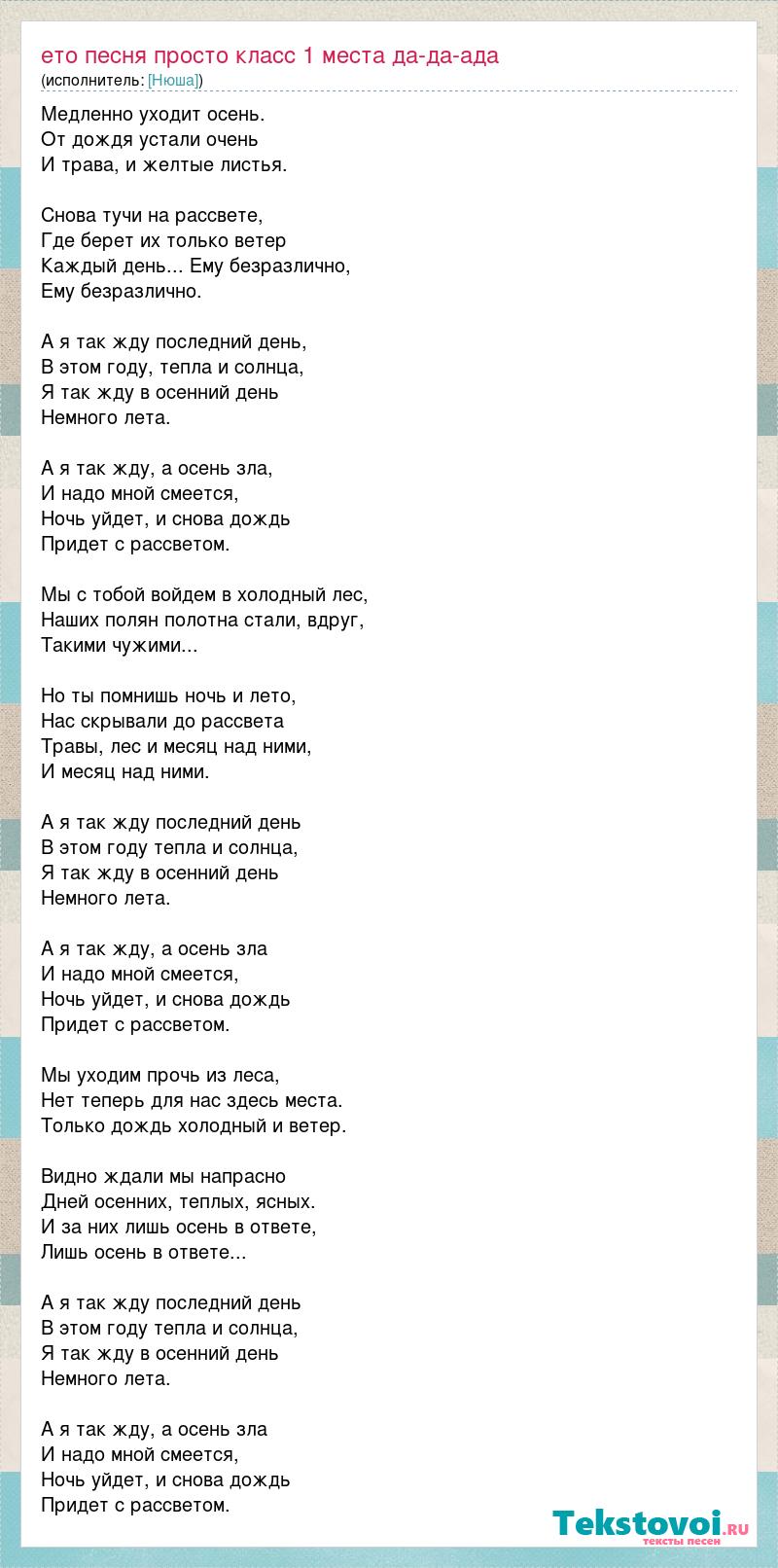 Медленно уходит осень. От дождя устали очень И трава, и желтые листья. Снова тучи на рассвете, Где берет их только ветер Каждый день... Ему безразлично, Ему безразлично. А я так жду последний день, В этом году, тепла и солнца, Я так жду в осенний день Немного лета. А я так жду, а осень зла, И надо мной смеется, Ночь уйдет, и снова дождь Придет с рассветом. Мы с тобой войдем в холодный лес, Наших полян полотна стали, вдруг, Такими чужими... Но ты помнишь ночь и лето, Нас скрывали до рассвета Травы, лес и месяц над ними, И месяц над ними. А я так жду последний день В этом году тепла и солнца, Я так жду в осенний день Немного лета. А я так жду, а осень зла И надо мной смеется, Ночь уйдет, и снова дождь Придет с рассветом. Мы уходим прочь из леса, Нет теперь для нас здесь места. Только дождь холодный и ветер. Видно ждали мы напрасно Дней осенних, теплых, ясных. И за них лишь осень в ответе, Лишь осень в ответе... А я так жду последний день В этом году тепла и солнца, Я так жду в осенний день Немного лета. А я так жду, а осень зла И надо мной смеется, Ночь уйдет, и снова дождь Придет с рассветом.