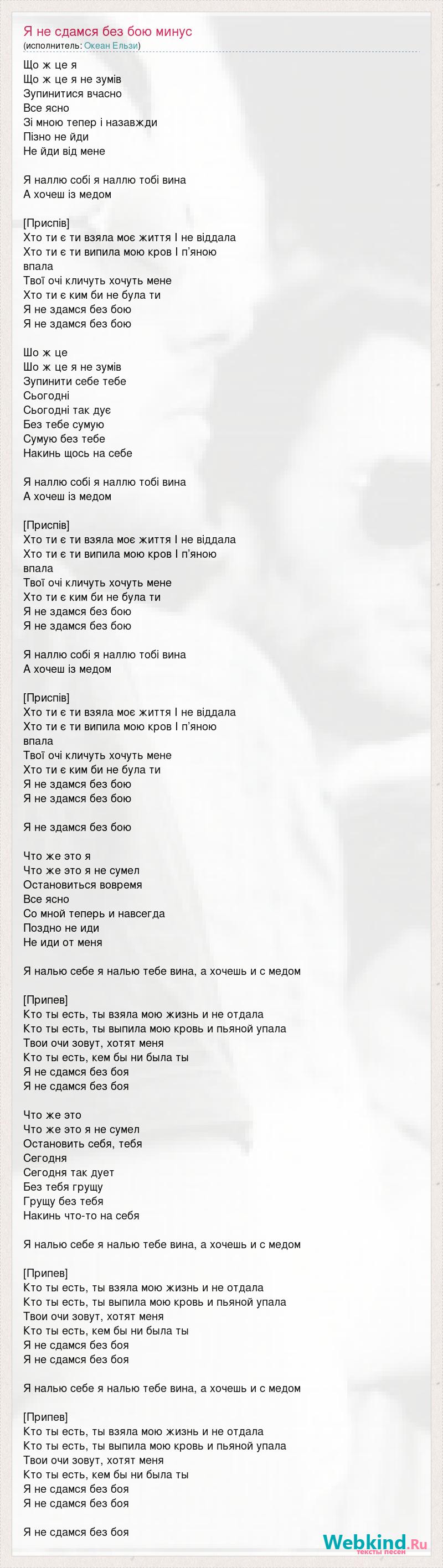 Що ж це я Що ж це я не зумів Зупинитися вчасно Все ясно Зі мною тепер і назавжди Пізно не йди Не йди від мене Я наллю собі я наллю тобі вина А хочеш із медом [Приспів] Хто ти є ти взяла моє життя І не віддала Хто ти є ти випила мою кров І п’яною впала Твої очі кличуть хочуть мене Хто ти є ким би не була ти Я не здамся без бою Я не здамся без бою Шо ж це Шо ж це я не зумів Зупинити себе тебе Сьогодні Сьогодні так дує Без тебе сумую Сумую без тебе Накинь щось на себе Я наллю собі я наллю тобі вина А хочеш із медом [Приспів] Хто ти є ти взяла моє життя І не віддала Хто ти є ти випила мою кров І п’яною впала Твої очі кличуть хочуть мене Хто ти є ким би не була ти Я не здамся без бою Я не здамся без бою Я наллю собі я наллю тобі вина А хочеш із медом [Приспів] Хто ти є ти взяла моє життя І не віддала Хто ти є ти випила мою кров І п’яною впала Твої очі кличуть хочуть мене Хто ти є ким би не була ти Я не здамся без бою Я не здамся без бою Я не здамся без бою Что же это я Что же это я не сумел Остановиться вовремя Все ясно Со мной теперь и навсегда Поздно не иди Не иди от меня Я налью себе я налью тебе вина, а хочешь и с медом [Припев] Кто ты есть, ты взяла мою жизнь и не отдала Кто ты есть, ты выпила мою кровь и пьяной упала Твои очи зовут, хотят меня Кто ты есть, кем бы ни была ты Я не сдамся без боя Я не сдамся без боя Что же это Что же это я не сумел Остановить себя, тебя Сегодня Сегодня так дует Без тебя грущу Грущу без тебя Накинь что-то на себя Я налью себе я налью тебе вина, а хочешь и с медом [Припев] Кто ты есть, ты взяла мою жизнь и не отдала Кто ты есть, ты выпила мою кровь и пьяной упала Твои очи зовут, хотят меня Кто ты есть, кем бы ни была ты Я не сдамся без боя Я не сдамся без боя Я налью себе я налью тебе вина, а хочешь и с медом [Припев] Кто ты есть, ты взяла мою жизнь и не отдала Кто ты есть, ты выпила мою кровь и пьяной упала Твои очи зовут, хотят меня Кто ты есть, кем бы ни была ты Я не сдамся без боя Я не сдамся без боя Я не сдамся без боя