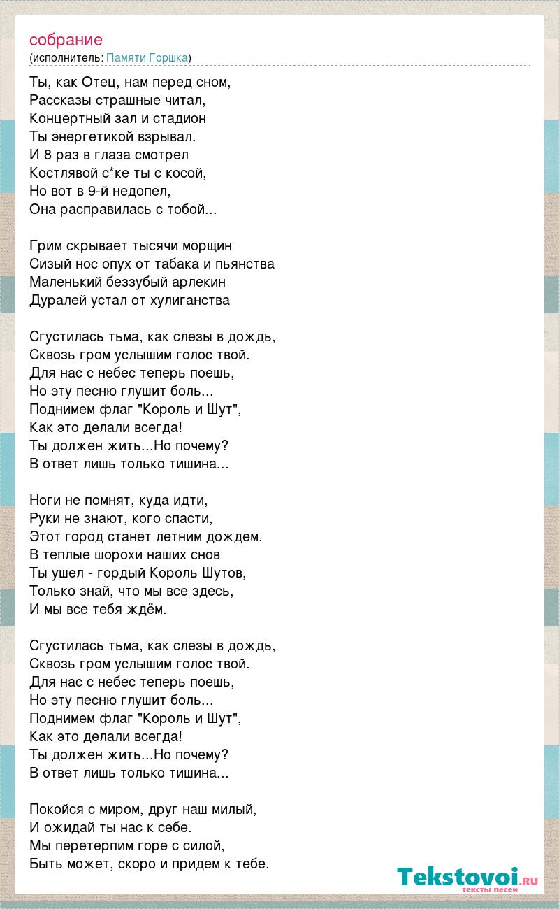 Ты, как Отец, нам перед сном, Рассказы страшные читал, Концертный зал и стадион Ты энергетикой взрывал. И 8 раз в глаза смотрел Костлявой с*ке ты с косой, Но вот в 9-й недопел, Она расправилась с тобой... Грим скрывает тысячи морщин Сизый нос опух от табака и пьянства Маленький беззубый арлекин Дуралей устал от хулиганства Сгустилась тьма, как слезы в дождь, Сквозь гром услышим голос твой. Для нас с небес теперь поешь, Но эту песню глушит боль... Поднимем флаг "Король и Шут", Как это делали всегда! Ты должен жить...Но почему? В ответ лишь только тишина... Ноги не помнят, куда идти, Руки не знают, кого спасти, Этот город станет летним дождем. В теплые шорохи наших снов Ты ушел - гордый Король Шутов, Только знай, что мы все здесь, И мы все тебя ждём. Сгустилась тьма, как слезы в дождь, Сквозь гром услышим голос твой. Для нас с небес теперь поешь, Но эту песню глушит боль... Поднимем флаг "Король и Шут", Как это делали всегда! Ты должен жить...Но почему? В ответ лишь только тишина... Покойся с миром, друг наш милый, И ожидай ты нас к себе. Мы перетерпим горе с силой, Быть может, скоро и придем к тебе.
