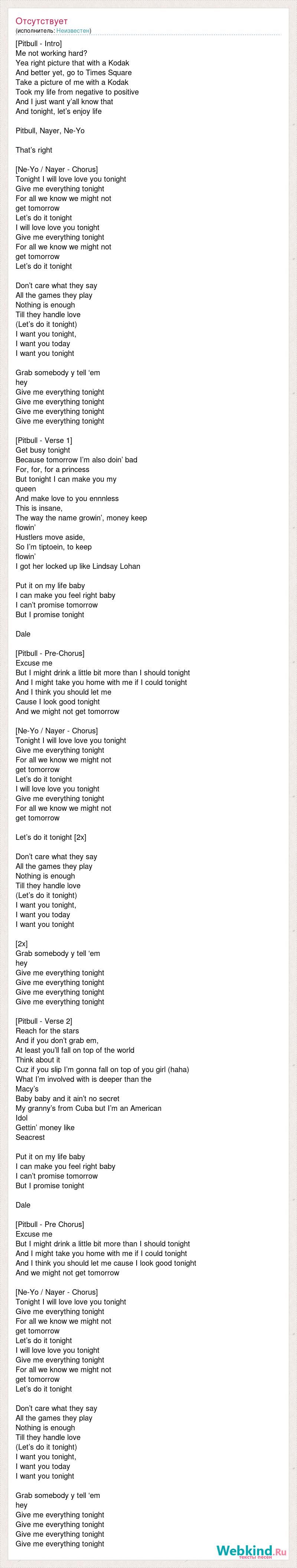 [Pitbull - Intro] Me not working hard? Yea right picture that with a Kodak And better yet, go to Times Square Take a picture of me with a Kodak Took my life from negative to positive And I just want y’all know that And tonight, let’s enjoy life Pitbull, Nayer, Ne-Yo That’s right [Ne-Yo / Nayer - Chorus] Tonight I will love love you tonight Give me everything tonight For all we know we might not get tomorrow Let’s do it tonight I will love love you tonight Give me everything tonight For all we know we might not get tomorrow Let’s do it tonight Don’t care what they say All the games they play Nothing is enough Till they handle love (Let’s do it tonight) I want you tonight, I want you today I want you tonight Grab somebody y tell ‘em hey Give me everything tonight Give me everything tonight Give me everything tonight Give me everything tonight [Pitbull - Verse 1] Get busy tonight Because tomorrow I’m also doin’ bad For, for, for a princess But tonight I can make you my queen And make love to you ennnless This is insane, The way the name growin’, money keep flowin’ Hustlers move aside, So I’m tiptoein, to keep flowin’ I got her locked up like Lindsay Lohan Put it on my life baby I can make you feel right baby I can’t promise tomorrow But I promise tonight Dale [Pitbull - Pre-Chorus] Excuse me But I might drink a little bit more than I should tonight And I might take you home with me if I could tonight And I think you should let me Cause I look good tonight And we might not get tomorrow [Ne-Yo / Nayer - Chorus] Tonight I will love love you tonight Give me everything tonight For all we know we might not get tomorrow Let’s do it tonight I will love love you tonight Give me everything tonight For all we know we might not get tomorrow Let’s do it tonight [2x] Don’t care what they say All the games they play Nothing is enough Till they handle love (Let’s do it tonight) I want you tonight, I want you today I want you tonight [2x] Grab somebody y tell ‘em hey Give me everything tonight Give me everything tonight Give me everything tonight Give me everything tonight [Pitbull - Verse 2] Reach for the stars And if you don’t grab em, At least you’ll fall on top of the world Think about it Cuz if you slip I’m gonna fall on top of you girl (haha) What I’m involved with is deeper than the Macy’s Baby baby and it ain’t no secret My granny’s from Cuba but I’m an American Idol Gettin’ money like Seacrest Put it on my life baby I can make you feel right baby I can’t promise tomorrow But I promise tonight Dale [Pitbull - Pre Chorus] Excuse me But I might drink a little bit more than I should tonight And I might take you home with me if I could tonight And I think you should let me cause I look good tonight And we might not get tomorrow [Ne-Yo / Nayer - Chorus] Tonight I will love love you tonight Give me everything tonight For all we know we might not get tomorrow Let’s do it tonight I will love love you tonight Give me everything tonight For all we know we might not get tomorrow Let’s do it tonight Don’t care what they say All the games they play Nothing is enough Till they handle love (Let’s do it tonight) I want you tonight, I want you today I want you tonight Grab somebody y tell ‘em hey Give me everything tonight Give me everything tonight Give me everything tonight Give me everything tonight