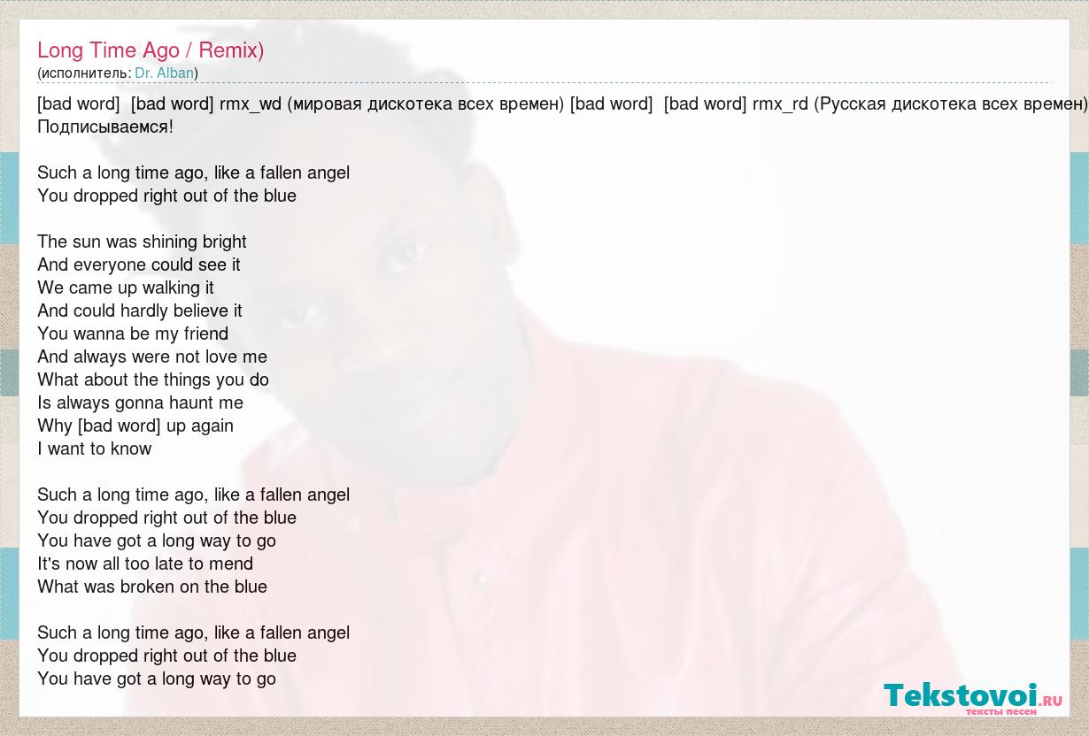 [bad word] [bad word] rmx_wd (мировая дискотека всех времен) [bad word] [bad word] rmx_rd (Русская дискотека всех времен) Подписываемся! Such a long time ago, like a fallen angel You dropped right out of the blue The sun was shining bright And everyone could see it We came up walking it And could hardly believe it You wanna be my friend And always were not love me What about the things you do Is always gonna haunt me Why you comin up again I want to know Such a long time ago, like a fallen angel You dropped right out of the blue You have got a long way to go It's now all too late to mend What was broken on the blue Such a long time ago, like a fallen angel You dropped right out of the blue You have got a long way to go