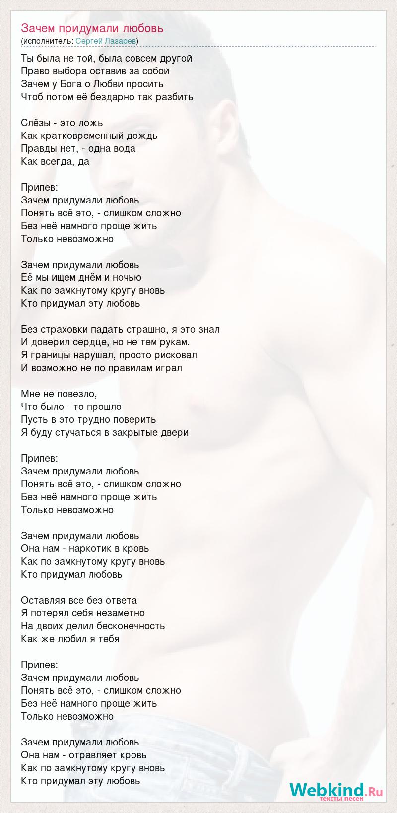 Ты была не той, была совсем другой Право выбора оставив за собой Зачем у Бога о Любви просить Чтоб потом её бездарно так разбить Слёзы - это ложь Как кратковременный дождь Правды нет, - одна вода Как всегда, да Припев: Зачем придумали любовь Понять всё это, - слишком сложно Без неё намного проще жить Только невозможно Зачем придумали любовь Её мы ищем днём и ночью Как по замкнутому кругу вновь Кто придумал эту любовь Без страховки падать страшно, я это знал И доверил сердце, но не тем рукам. Я границы нарушал, просто рисковал И возможно не по правилам играл Мне не повезло, Что было - то прошло Пусть в это трудно поверить Я буду стучаться в закрытые двери Припев: Зачем придумали любовь Понять всё это, - слишком сложно Без неё намного проще жить Только невозможно Зачем придумали любовь Она нам - наркотик в кровь Как по замкнутому кругу вновь Кто придумал любовь Оставляя все без ответа Я потерял себя незаметно На двоих делил бесконечность Как же любил я тебя Припев: Зачем придумали любовь Понять всё это, - слишком сложно Без неё намного проще жить Только невозможно Зачем придумали любовь Она нам - отравляет кровь Как по замкнутому кругу вновь Кто придумал эту любовь