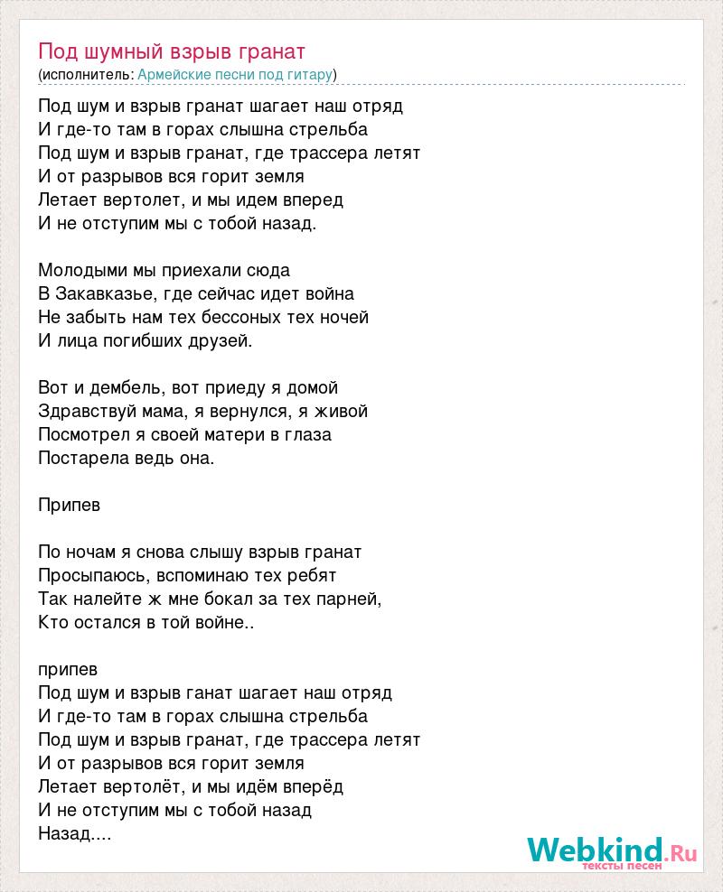 Под шум и взрыв гранат шагает наш отряд И где-то там в горах слышна стрельба Под шум и взрыв гранат, где трассера летят И от разрывов вся горит земля Летает вертолет, и мы идем вперед И не отступим мы с тобой назад. Молодыми мы приехали сюда В Закавказье, где сейчас идет война Не забыть нам тех бессоных тех ночей И лица погибших друзей. Вот и дембель, вот приеду я домой Здравствуй мама, я вернулся, я живой Посмотрел я своей матери в глаза Постарела ведь она. Припев По ночам я снова слышу взрыв гранат Просыпаюсь, вспоминаю тех ребят Так налейте ж мне бокал за тех парней, Кто остался в той войне.. припев Под шум и взрыв ганат шагает наш отряд И где-то там в горах слышна стрельба Под шум и взрыв гранат, где трассера летят И от разрывов вся горит земля Летает вертолёт, и мы идём вперёд И не отступим мы с тобой назад Назад....