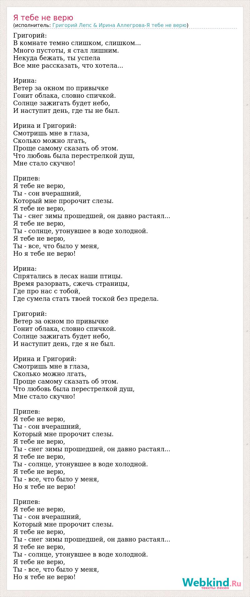 Григорий: В комнате темно cлишком, слишком... Много пустоты, я стал лишним. Некуда бежать, ты успела Все мне рассказать, что хотела... Ирина: Ветер за окном по привычке Гонит облака, словно спичкой. Солнце зажигать будет небо, И наступит день, где ты не был. Ирина и Григорий: Смотришь мне в глаза, Сколько можно лгать, Проще самому сказать об этом. Что любовь была перестрелкой душ, Мне стало скучно! Припев: Я тебе не верю, Ты - сон вчерашний, Который мне пророчит слезы. Я тебе не верю, Ты - снег зимы прошедшей, он давно растаял... Я тебе не верю, Ты - солнце, утонувшее в воде холодной. Я тебе не верю, Ты - все, что было у меня, Но я тебе не верю! Ирина: Спрятались в лесах наши птицы. Время разорвать, сжечь страницы, Где про нас с тобой, Где сумела стать твоей тоской без предела. Григорий: Ветер за окном по привычке Гонит облака, словно спичкой. Солнце зажигать будет небо, И наступит день, где я не был. Ирина и Григорий: Смотришь мне в глаза, Сколько можно лгать, Проще самому сказать об этом. Что любовь была перестрелкой душ, Мне стало скучно! Припев: Я тебе не верю, Ты - сон вчерашний, Который мне пророчит слезы. Я тебе не верю, Ты - снег зимы прошедшей, он давно растаял... Я тебе не верю, Ты - солнце, утонувшее в воде холодной. Я тебе не верю, Ты - все, что было у меня, Но я тебе не верю! Припев: Я тебе не верю, Ты - сон вчерашний, Который мне пророчит слезы. Я тебе не верю, Ты - снег зимы прошедшей, он давно растаял... Я тебе не верю, Ты - солнце, утонувшее в воде холодной. Я тебе не верю, Ты - все, что было у меня, Но я тебе не верю!