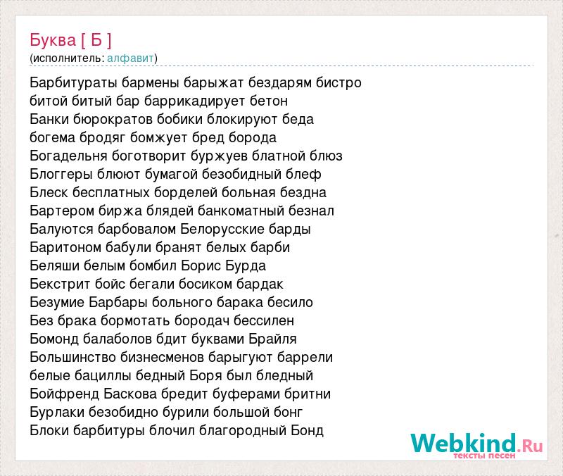 Барбитураты бармены барыжат бездарям бистро битой битый бар баррикадирует бетон Банки бюрократов бобики блокируют беда богема бродяг бомжует бред борода Богадельня боготворит буржуев блатной блюз Блоггеры блюют бумагой безобидный блеф Блеск бесплатных борделей больная бездна Бартером биржа блядей банкоматный безнал Балуются барбовалом Белорусские барды Баритоном бабули бранят белых барби Беляши белым бомбил Борис Бурда Бекстрит бойс бегали босиком бардак Безумие Барбары больного барака бесило Без брака бормотать бородач бессилен Бомонд балаболов бдит буквами Брайля Большинство бизнесменов барыгуют баррели белые бациллы бедный Боря был бледный Бойфренд Баскова бредит буферами бритни Бурлаки безобидно бурили большой бонг Блоки барбитуры блочил благородный Бонд