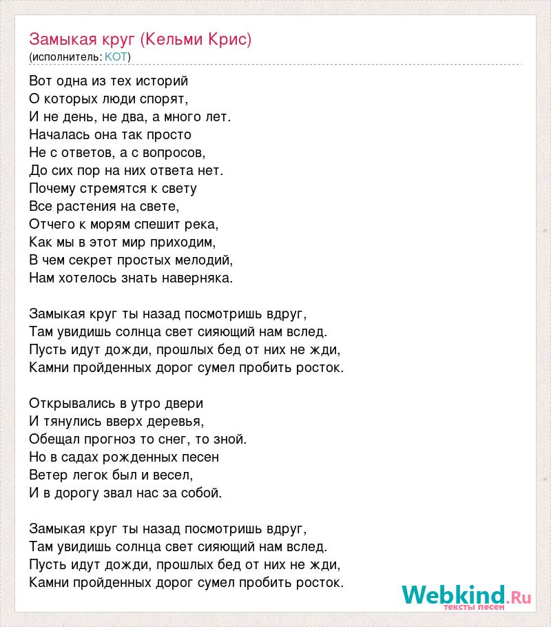 Вот одна из тех историй О которых люди спорят, И не день, не два, а много лет. Началась она так просто Не с ответов, а с вопросов, До сих пор на них ответа нет. Почему стремятся к свету Все растения на свете, Отчего к морям спешит река, Как мы в этот мир приходим, В чем секрет простых мелодий, Нам хотелось знать наверняка. Замыкая круг ты назад посмотришь вдруг, Там увидишь солнца свет сияющий нам вслед. Пусть идут дожди, прошлых бед от них не жди, Камни пройденных дорог сумел пробить росток. Открывались в утро двери И тянулись вверх деревья, Обещал прогноз то снег, то зной. Но в садах рожденных песен Ветер легок был и весел, И в дорогу звал нас за собой. Замыкая круг ты назад посмотришь вдруг, Там увидишь солнца свет сияющий нам вслед. Пусть идут дожди, прошлых бед от них не жди, Камни пройденных дорог сумел пробить росток.