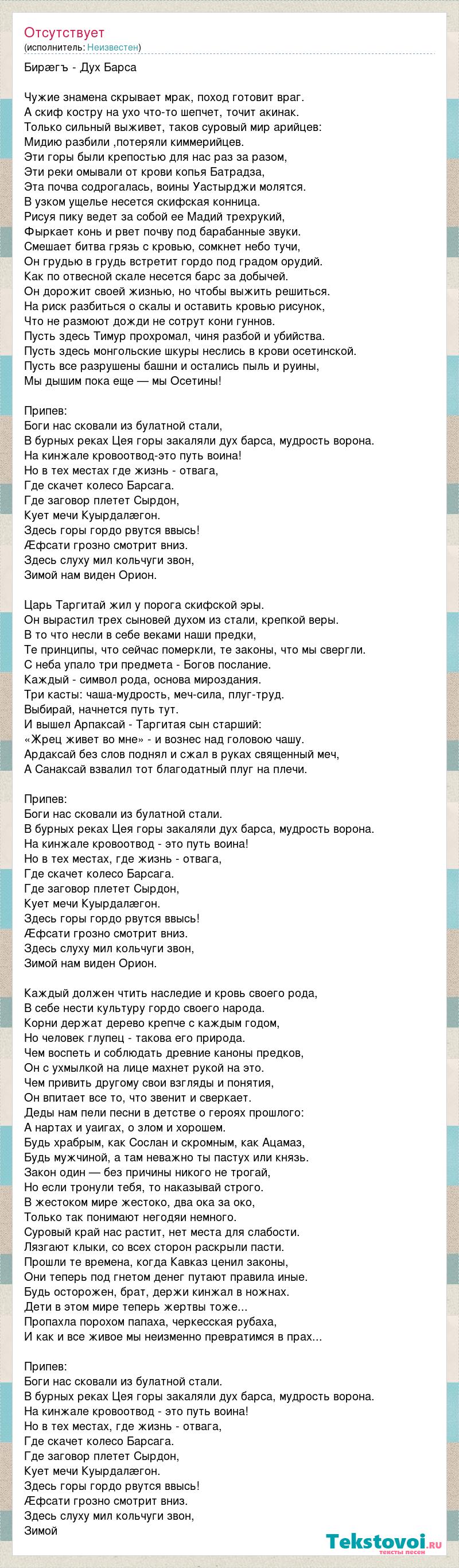 Бирæгъ - Дух Барса Чужие знамена скрывает мрак, поход готовит враг. А скиф костру на ухо что-то шепчет, точит акинак. Только сильный выживет, таков суровый мир арийцев: Мидию разбили ,потеряли киммерийцев. Эти горы были крепостью для нас раз за разом, Эти реки омывали от крови копья Батрадза, Эта почва содрогалась, воины Уастырджи молятся. В узком ущелье несется скифская конница. Рисуя пику ведет за собой ее Мадий трехрукий, Фыркает конь и рвет почву под барабанные звуки. Смешает битва грязь с кровью, сомкнет небо тучи, Он грудью в грудь встретит гордо под градом орудий. Как по отвесной скале несется барс за добычей. Он дорожит своей жизнью, но чтобы выжить решиться. На риск разбиться о скалы и оставить кровью рисунок, Что не размоют дожди не сотрут кони гуннов. Пусть здесь Тимур прохромал, чиня разбой и убийства. Пусть здесь монгольские шкуры неслись в крови осетинской. Пусть все разрушены башни и остались пыль и руины, Мы дышим пока еще — мы Осетины! Припев: Боги нас сковали из булатной стали, В бурных реках Цея горы закаляли дух барса, мудрость ворона. На кинжале кровоотвод-это путь воина! Но в тех местах где жизнь - отвага, Где скачет колесо Барсага. Где заговор плетет Сырдон, Кует мечи Куырдалæгон. Здесь горы гордо рвутся ввысь! Æфсати грозно смотрит вниз. Здесь слуху мил кольчуги звон, Зимой нам виден Орион. Царь Таргитай жил у порога скифской эры. Он вырастил трех сыновей духом из стали, крепкой веры. В то что несли в себе веками наши предки, Те принципы, что сейчас померкли, те законы, что мы свергли. С неба упало три предмета - Богов послание. Каждый - символ рода, основа мироздания. Три касты: чаша-мудрость, меч-сила, плуг-труд. Выбирай, начнется путь тут. И вышел Арпаксай - Таргитая сын старший: «Жрец живет во мне» - и вознес над головою чашу. Ардаксай без слов поднял и сжал в руках священный меч, А Санаксай взвалил тот благодатный плуг на плечи. Припев: Боги нас сковали из булатной стали. В бурных реках Цея горы закаляли дух барса, мудрость ворона. На кинжале кровоотвод - это путь воина! Но в тех местах, где жизнь - отвага, Где скачет колесо Барсага. Где заговор плетет Сырдон, Кует мечи Куырдалæгон. Здесь горы гордо рвутся ввысь! Æфсати грозно смотрит вниз. Здесь слуху мил кольчуги звон, Зимой нам виден Орион. Каждый должен чтить наследие и кровь своего рода, В себе нести культуру гордо своего народа. Корни держат дерево крепче с каждым годом, Но человек глупец - такова его природа. Чем воспеть и соблюдать древние каноны предков, Он с ухмылкой на лице махнет рукой на это. Чем привить другому свои взгляды и понятия, Он впитает все то, что звенит и сверкает. Деды нам пели песни в детстве о героях прошлого: А нартах и уаигах, о злом и хорошем. Будь храбрым, как Сослан и скромным, как Ацамаз, Будь мужчиной, а там неважно ты пастух или князь. Закон один — без причины никого не трогай, Но если тронули тебя, то наказывай строго. В жестоком мире жестоко, два ока за око, Только так понимают негодяи немного. Суровый край нас растит, нет места для слабости. Лязгают клыки, со всех сторон раскрыли пасти. Прошли те времена, когда Кавказ ценил законы, Они теперь под гнетом денег путают правила иные. Будь осторожен, брат, держи кинжал в ножнах. Дети в этом мире теперь жертвы тоже... Пропахла порохом папаха, черкесская рубаха, И как и все живое мы неизменно превратимся в прах... Припе