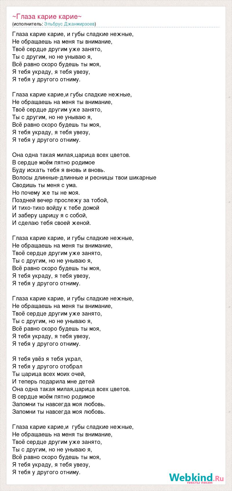 Глаза карие карие, и губы сладкие нежные, Не обращаешь на меня ты внимание, Твоё сердце другим уже занято, Ты с другим, но не унываю я, Всё равно скоро будешь ты моя, Я тебя украду, я тебя увезу, Я тебя у другого отниму. Глаза карие карие,и губы сладкие нежные, Не обращаешь на меня ты внимание, Твоё сердце другим уже занято, Ты с другим, но не унываю я, Всё равно скоро будешь ты моя, Я тебя украду, я тебя увезу, Я тебя у другого отниму. Она одна такая милая,царица всех цветов. В сердце моём пятно родимое Буду искать тебя я вновь и вновь. Волосы длинные-длинные и ресницы твои шикарные Сводишь ты меня с ума. Но почему же ты не моя. Поздней вечер прослежу за тобой, И тихо-тихо войду к тебе домой И заберу царицу я с собой, И сделаю тебя своей женой. Глаза карие карие, и губы сладкие нежные, Не обращаешь на меня ты внимание, Твоё сердце другим уже занято, Ты с другим, но не унываю я, Всё равно скоро будешь ты моя, Я тебя украду, я тебя увезу, Я тебя у другого отниму. Глаза карие карие, и губы сладкие нежные, Не обращаешь на меня ты внимание, Твоё сердце другим уже занято, Ты с другим, но не унываю я, Всё равно скоро будешь ты моя, Я тебя украду, я тебя увезу, Я тебя у другого отниму. Я тебя увёз я тебя украл, Я тебя у другого отобрал Ты царица всех моих очей, И теперь подарила мне детей Она одна такая милая,царица всех цветов. В сердце моём пятно родимое Запомни ты навсегда моя любовь. Запомни ты навсегда моя любовь. Глаза карие карие,и губы сладкие нежные, Не обращаешь на меня ты внимание, Твоё сердце другим уже занято, Ты с другим, но не унываю я, Всё равно скоро будешь ты моя, Я тебя украду, я тебя увезу, Я тебя у другого отниму.