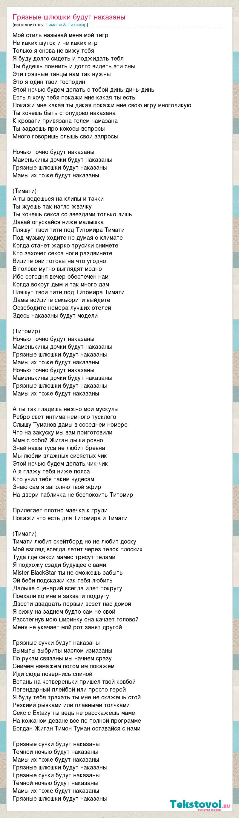 Мой стиль называй меня мой тигр Не каких шуток и не каких игр Только я снова не вижу тебя Я буду долго сидеть и поджидать тебя Ты будешь помнить и долго видеть эти сны Эти грязные танцы нам так нужны Это я один твой господин Этой ночью будем делать с тобой динь-динь-динь Есть я хочу тебя покажи мне какая ты есть Покажи мне какая ты дикая покажи мне свою игру многоликую Ты хочешь быть стопудово наказана К кровати привязана гелем намазана Ты задаешь про кокосы вопросы Много говоришь слышь свои запросы Ночью точно будут наказаны Маменькины дочки будут наказаны Грязные шлюшки будут наказаны Мамы их тоже будут наказаны (Тимати) А ты ведешься на клипы и тачки Ты жуешь так нагло жвачку Ты хочешь секса со звездами только лишь Давай опускайся ниже малышка Пляшут твои тити под Титомира Тимати Под музыку ходите не думая о климате Когда станет жарко трусики снимете Кто захочет секса ноги раздвинете Видите они готовы на что угодно В голове мутно выглядят модно Ибо сегодня вечер обеспечен нам Когда вокруг дым и так много дам Пляшут твои тити под Титомира Тимати Дамы войдите секьюрити выйдете Освободите номера лучших отелей Здесь наказаны будут модели (Титомир) Ночью точно будут наказаны Маменькины дочки будут наказаны Грязные шлюшки будут наказаны Мамы их тоже будут наказаны Ночью точно будут наказаны Маменькины дочки будут наказаны Грязные шлюшки будут наказаны Мамы их тоже будут наказаны А ты так гладишь нежно мои мускулы Ребро свет интима немного тусклого Слышу Туманов дамы в соседнем номере Что на закуску мы вам приготовили Ммм с собой Жиган дыши ровно Знай наша туса не любит бревна Мы любим влажных сисястых чик Этой ночью будем делать чик-чик А я глажу тебя ниже пояса Кто учил тебя таким чудесам Знаю сам я заполню твой эфир На двери табличка не беспокоить Титомир Прилегает плотно маечка к груди Покажи что есть для Титомира и Тимати (Тимати) Тимати любит скейтборд но не любит доску Мой взгляд всегда летит через телок плоских Туда где секси мамис трясут телами Я подхожу сзади будущее с вами Mister BlackStar ты не сможешь забыть Эй беби подскажи как тебя любить Дальше сценарий всегда идет покругу Поехали ко мне и захвати подругу Двести двадцать первый везет нас домой Я сижу на заднем будто сам не свой Расстегнув мою ширинку она качает головой Меня не укачает мой рот занят другой Грязные сучки будут наказаны Вымыты выбриты маслом измазаны По рукам связаны мы начнем сразу Снимем намажем потом им покажем Иди сюда повернись спиной Встань на четвереньки пришел твой ковбой Легендарный плейбой или просто герой Я буду тебя трахать ты мне не скажешь стой Резкими рывками или плавными толчками Секс с Extazy ты ведь не расскажешь маме На кожаном деване все по полной программе Богдан Жиган Тимон Туман оставайся с нами Грязные сучки будут наказаны Темной ночью будут наказаны Мамы их тоже будут наказаны Грязные шлюшки будут наказаны Грязные сучки будут наказаны Темной ночью будут наказаны Мамы их тоже будут наказаны Грязные шлюшки будут наказаны