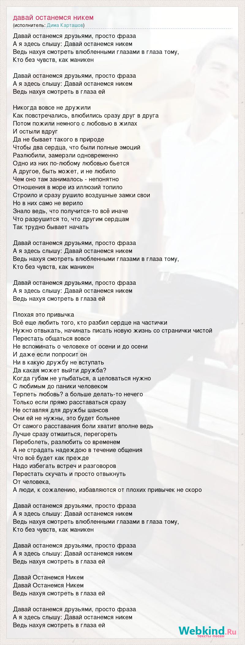 Давай останемся друзьями, просто фраза А я здесь слышу: Давай останемся никем Ведь нахуя смотреть влюбленными глазами в глаза тому, Кто без чувств, как маникен Давай останемся друзьями, просто фраза А я здесь слышу: Давай останемся никем Ведь нахуя смотреть в глаза ей Никогда вовсе не дружили Как повстречались, влюбились сразу друг в друга Потом пожили немного с любовью в жилах И остыли вдруг Да не бывает такого в природе Чтобы два сердца, что были полные эмоций Разлюбили, замерзли одновременно Одно из них по-любому любовью бьется А другое, быть может, и не любило Чем оно там занималось - непонятно Отношения в море из иллюзий топило Строило и сразу рушило воздушные замки свои Но в них само не верило Знало ведь, что получится-то всё иначе Что разрушится то, что другим сердцам Так трудно бывает начать Давай останемся друзьями, просто фраза А я здесь слышу: Давай останемся никем Ведь нахуя смотреть влюбленными глазами в глаза тому, Кто без чувств, как маникен Давай останемся друзьями, просто фраза А я здесь слышу: Давай останемся никем Ведь нахуя смотреть в глаза ей Плохая это привычка Всё еще любить того, кто разбил сердце на частички Нужно отвыкать, начинать писать новую жизнь со странички чистой Перестать общаться вовсе Не вспоминать о человеке от осени и до осени И даже если попросит он Ни в какую дружбу не вступать Да какая может выйти дружба? Когда губам не улыбаться, а целоваться нужно С любимым до паники человеком Терпеть любовь? а больше делать-то нечего Только если прямо расставаться сразу Не оставляя для дружбы шансов Они ей не нужны, это будет больнее От самого расставания боли хватит вполне ведь Лучше сразу отмаиться, перегореть Переболеть, разлюбить со временем А не страдать надеждою в течение общения Что всё будет как прежде Надо избегать встреч и разговоров Перестать скучать и просто отвыкнуть От человека, А люди, к сожалению, избавляются от плохих привычек не скоро Давай останемся друзьями, просто фраза А я здесь слышу: Давай останемся никем Ведь нахуя смотреть влюбленными глазами в глаза тому, Кто без чувств, как маникен Давай останемся друзьями, просто фраза А я здесь слышу: Давай останемся никем Ведь нахуя смотреть в глаза ей Давай Останемся Никем Давай Останемся Никем Ведь нахуя смотреть в глаза ей Давай останемся друзьями, просто фраза А я здесь слышу: Давай останемся никем Ведь нахуя смотреть в глаза ей