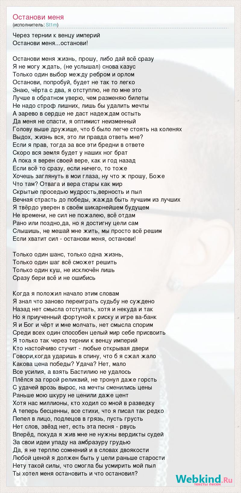 Через тернии к венцу империй Останови меня...останови! Останови меня жизнь, прошу, либо дай всё сразу Я не могу ждать, (не услышал) снова казус Только один выбор между ребром и орлом Останови, попробуй, будет не так то легко Знаю, чёрта с два, я отступлю, не по мне это Лучше в обратном уверю, чем разменяю билеты Не надо строф лишних, лишь бы удалить мечты А зарево в сердце не даст надеждам остыть Да меня не спасти, я оптимист неизменный Голову выше дружище, что б было легче стоять на коленях Выдох, жизнь вся, это ли правда ответь мне? Если я прав, тогда за все эти бредни в ответе Скоро вся земля будет у наших ног брат А пока я верен своей вере, как и год назад Если всё то сразу, если ничего, то тоже Хочешь заглянуть в мои глаза, ну что ж прошу, Боже Что там? Отвага и вера стары как мир Скрытые проседью мудрость,верность и пыл Вечная страсть до победы, жажда быть лучшим из лучших Я твёрдо уверен в своём шикарнейшем будущем Не времени, не сил не пожалею, всё отдам Рано или поздно,да, но я достигну цели сам Слышишь, не мешай мне жить, мы просто всё решим Если хватит сил - останови меня, останови! Только один шанс, только одна жизнь, Только один шаг всё сможет решить Только один куш, не исключён лишь Сразу бери всё и не ошибись Когда я положил начало этим словам Я знал что заново переиграть судьбу не суждено Назад нет смысла отступать, хотя и некуда и так Но я приученный фортуной к риску и игре ва-банк Я и Бог и чёрт и мне молчать, нет смысла спорим Среди всех один способен целый мир себе присвоить Я только так через тернии к венцу империй Кто настойчиво стучит - любые открывая двери Говори,когда ударишь в спину, что б я сжал жало Какова цена победы? Удача? Нет, мало Все усилия, а взять Бастилию не удалось Плёлся за горой реликвий, не тронул даже горсть С удачей врозь вырос, на мечты сменились цены Раньше мою шкуру не ценили даже цент Хотя нас миллионы, кто ходил со мной в разведку А теперь бесценны, все стихи, что я писал так редко Пепел в лицо, подлецов в грязь, пусть грусть Нет слов, звёзд нет, есть эта песня - рвусь Вперёд, покуда я жив мне не нужны вердикты судей За свои идеи упаду на амбразуру грудью Да, я не терплю сомнений и в словах двоякости Любой ценой я должен быть у цели раньше старости Нету такой силы, что смогла бы усмирить мой пыл Ты хотел меня остановить и что остановил?