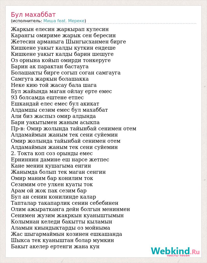 Жаркын елесин жаркырап кулесин Карангы омириме жарык сен бересин Жетесин арманыга Шынгысханмен бирге Кишкене уакыт калды куткин ендеше Кишкене уакыт калды барин шешуге Оз орнына койып омирди тонкеруге Барин ак парактан бастауга Болашакты бирге согып соган самгауга Самгуга жаркын болашакка Неке кию той жасау бала шага Бул жайында маган ойлау ерте емес 93 болсамда ештене етпес Ешкандай елес емес бул акикат Алдамшы сезим емес бул махаббат Али биз жаспыз омир алдында Бари уакытымен жаным асыкпа Пр-в: Омир жолында тайынбай сенимен отем Алдамаймын жаным тек сени суйемин Омир жолында тайынбай сенимен отем Алдамаймын жаным тек сени суйемин 2. Токта коп соз орынды емес Ерниннин дамине еш нарсе жетпес Кане менин кушагыма енгин Жанымда болып тек маган сенгин Омир маним бар конилим ток Сезимим оте улкен куаты ток Арам ой жок пак сезим бар Бул ан сенин конилинде калар Тапталар такапарлик сенин себебинен Олим ажыратканга дейн болгын менинмен Сенимен жузим жакркын куаныштымын Колымнан келеди бакытты кыламын Аламын киындыктарды оз мойныма Жас шыгармаймын козинен ешкашанда Шыкса тек куаныштан болар мумкин Бакыт акелер ертенги жана кун