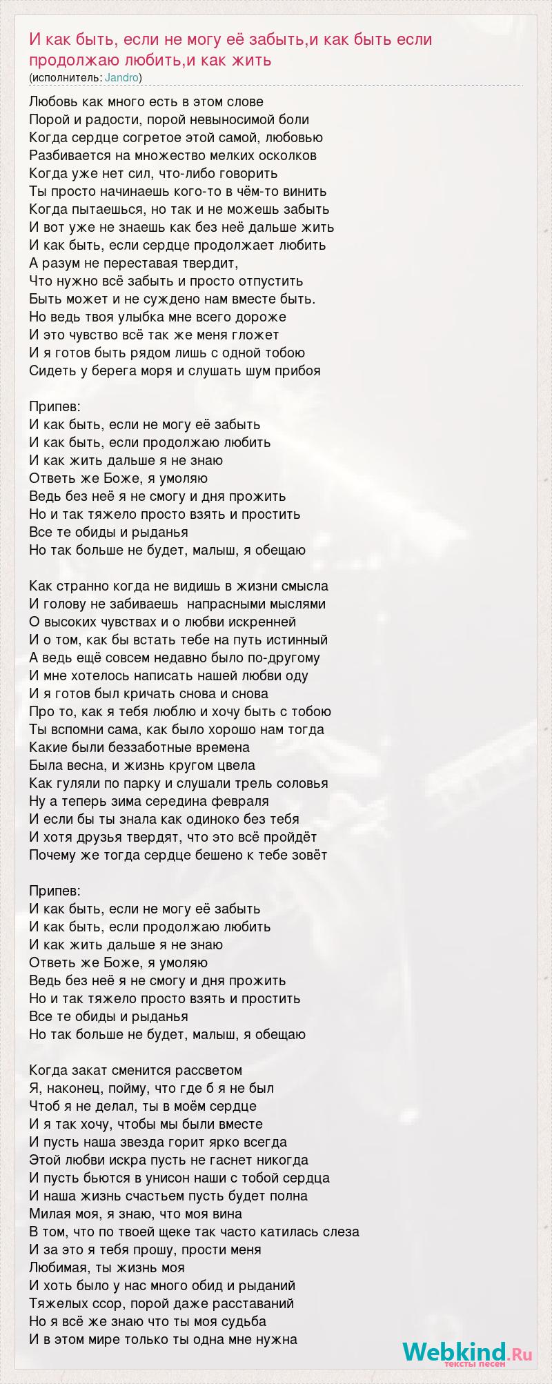 Любовь как много есть в этом слове Порой и радости, порой невыносимой боли Когда сердце согретое этой самой, любовью Разбивается на множество мелких осколков Когда уже нет сил, что-либо говорить Ты просто начинаешь кого-то в чём-то винить Когда пытаешься, но так и не можешь забыть И вот уже не знаешь как без неё дальше жить И как быть, если сердце продолжает любить А разум не переставая твердит, Что нужно всё забыть и просто отпустить Быть может и не суждено нам вместе быть. Но ведь твоя улыбка мне всего дороже И это чувство всё так же меня гложет И я готов быть рядом лишь с одной тобою Сидеть у берега моря и слушать шум прибоя Припев: И как быть, если не могу её забыть И как быть, если продолжаю любить И как жить дальше я не знаю Ответь же Боже, я умоляю Ведь без неё я не смогу и дня прожить Но и так тяжело просто взять и простить Все те обиды и рыданья Но так больше не будет, малыш, я обещаю Как странно когда не видишь в жизни смысла И голову не забиваешь напрасными мыслями О высоких чувствах и о любви искренней И о том, как бы встать тебе на путь истинный А ведь ещё совсем недавно было по-другому И мне хотелось написать нашей любви оду И я готов был кричать снова и снова Про то, как я тебя люблю и хочу быть с тобою Ты вспомни сама, как было хорошо нам тогда Какие были беззаботные времена Была весна, и жизнь кругом цвела Как гуляли по парку и слушали трель соловья Ну а теперь зима середина февраля И если бы ты знала как одиноко без тебя И хотя друзья твердят, что это всё пройдёт Почему же тогда сердце бешено к тебе зовёт Припев: И как быть, если не могу её забыть И как быть, если продолжаю любить И как жить дальше я не знаю Ответь же Боже, я умоляю Ведь без неё я не смогу и дня прожить Но и так тяжело просто взять и простить Все те обиды и рыданья Но так больше не будет, малыш, я обещаю Когда закат сменится рассветом Я, наконец, пойму, что где б я не был Чтоб я не делал, ты в моём сердце И я так хочу, чтобы мы были вместе И пусть наша звезда горит ярко всегда Этой любви искра пусть не гаснет никогда И пусть бьются в унисон наши с тобой сердца И наша жизнь счастьем пусть будет полна Милая моя, я знаю, что моя вина В том, что по твоей щеке так часто катилась слеза И за это я тебя прошу, прости меня Любимая, ты жизнь моя И хоть было у нас много обид и рыданий Тяжелых ссор, порой даже расставаний Но я всё же знаю что ты моя судьба И в этом мире только ты одна мне нужна