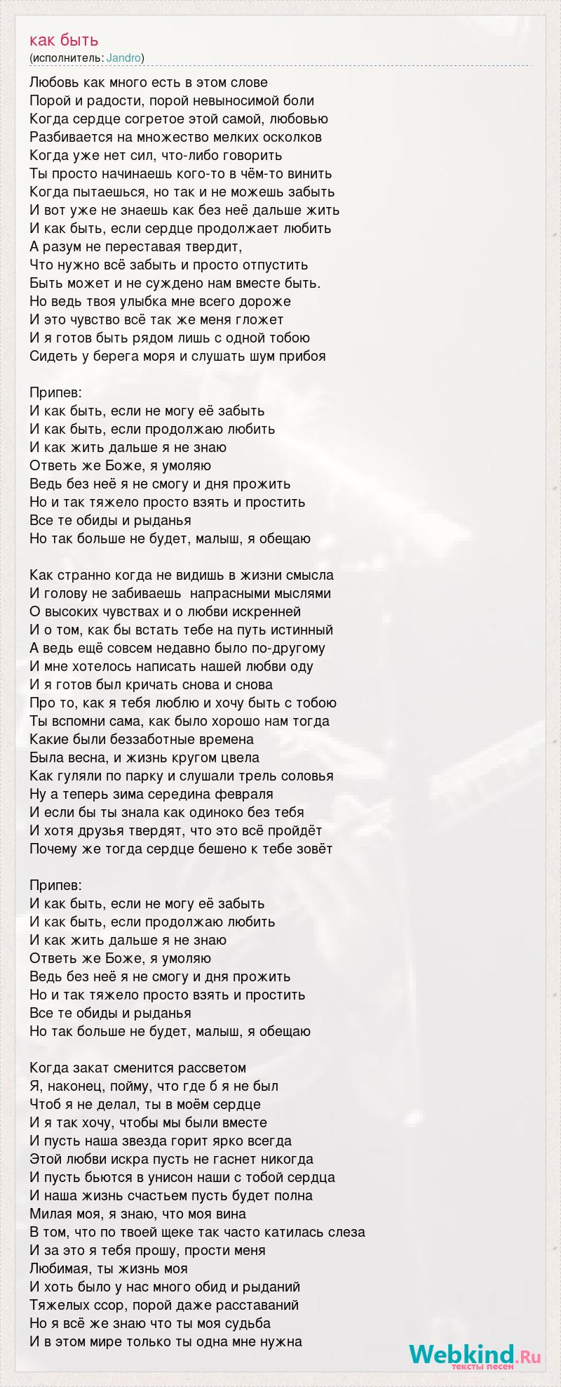 Любовь как много есть в этом слове Порой и радости, порой невыносимой боли Когда сердце согретое этой самой, любовью Разбивается на множество мелких осколков Когда уже нет сил, что-либо говорить Ты просто начинаешь кого-то в чём-то винить Когда пытаешься, но так и не можешь забыть И вот уже не знаешь как без неё дальше жить И как быть, если сердце продолжает любить А разум не переставая твердит, Что нужно всё забыть и просто отпустить Быть может и не суждено нам вместе быть. Но ведь твоя улыбка мне всего дороже И это чувство всё так же меня гложет И я готов быть рядом лишь с одной тобою Сидеть у берега моря и слушать шум прибоя Припев: И как быть, если не могу её забыть И как быть, если продолжаю любить И как жить дальше я не знаю Ответь же Боже, я умоляю Ведь без неё я не смогу и дня прожить Но и так тяжело просто взять и простить Все те обиды и рыданья Но так больше не будет, малыш, я обещаю Как странно когда не видишь в жизни смысла И голову не забиваешь напрасными мыслями О высоких чувствах и о любви искренней И о том, как бы встать тебе на путь истинный А ведь ещё совсем недавно было по-другому И мне хотелось написать нашей любви оду И я готов был кричать снова и снова Про то, как я тебя люблю и хочу быть с тобою Ты вспомни сама, как было хорошо нам тогда Какие были беззаботные времена Была весна, и жизнь кругом цвела Как гуляли по парку и слушали трель соловья Ну а теперь зима середина февраля И если бы ты знала как одиноко без тебя И хотя друзья твердят, что это всё пройдёт Почему же тогда сердце бешено к тебе зовёт Припев: И как быть, если не могу её забыть И как быть, если продолжаю любить И как жить дальше я не знаю Ответь же Боже, я умоляю Ведь без неё я не смогу и дня прожить Но и так тяжело просто взять и простить Все те обиды и рыданья Но так больше не будет, малыш, я обещаю Когда закат сменится рассветом Я, наконец, пойму, что где б я не был Чтоб я не делал, ты в моём сердце И я так хочу, чтобы мы были вместе И пусть наша звезда горит ярко всегда Этой любви искра пусть не гаснет никогда И пусть бьются в унисон наши с тобой сердца И наша жизнь счастьем пусть будет полна Милая моя, я знаю, что моя вина В том, что по твоей щеке так часто катилась слеза И за это я тебя прошу, прости меня Любимая, ты жизнь моя И хоть было у нас много обид и рыданий Тяжелых ссор, порой даже расставаний Но я всё же знаю что ты моя судьба И в этом мире только ты одна мне нужна