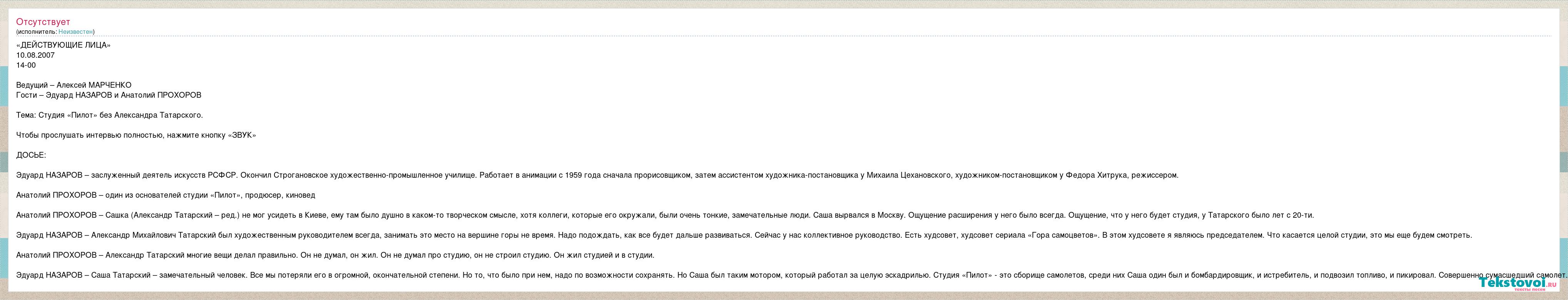 «ДЕЙСТВУЮЩИЕ ЛИЦА» 10.08.2007 14-00 Ведущий – Алексей МАРЧЕНКО Гости – Эдуард НАЗАРОВ и Анатолий ПРОХОРОВ Тема: Студия «Пилот» без Александра Татарского. Чтобы прослушать интервью полностью, нажмите кнопку «ЗВУК» ДОСЬЕ: Эдуард НАЗАРОВ – заслуженный деятель искусств РСФСР. Окончил Строгановское художественно-промышленное училище. Работает в анимации с 1959 года сначала прорисовщиком, затем ассистентом художника-постановщика у Михаила Цехановского, художником-постановщиком у Федора Хитрука, режиссером. Анатолий ПРОХОРОВ – один из основателей студии «Пилот», продюсер, киновед Анатолий ПРОХОРОВ – Сашка (Александр Татарский – ред.) не мог усидеть в Киеве, ему там было душно в каком-то творческом смысле, хотя коллеги, которые его окружали, были очень тонкие, замечательные люди. Саша вырвался в Москву. Ощущение расширения у него было всегда. Ощущение, что у него будет студия, у Татарского было лет с 20-ти. Эдуард НАЗАРОВ – Александр Михайлович Татарский был художественным руководителем всегда, занимать это место на вершине горы не время. Надо подождать, как все будет дальше развиваться. Сейчас у нас коллективное руководство. Есть худсовет, худсовет сериала «Гора самоцветов». В этом худсовете я являюсь председателем. Что касается целой студии, это мы еще будем смотреть. Анатолий ПРОХОРОВ – Александр Татарский многие вещи делал правильно. Он не думал, он жил. Он не думал про студию, он не строил студию. Он жил студией и в студии. Эдуард НАЗАРОВ – Саша Татарский – замечательный человек. Все мы потеряли его в огромной, окончательной степени. Но то, что было при нем, надо по возможности сохранять. Но Саша был таким мотором, который работал за целую эскадрилью. Студия «Пилот» - это сборище самолетов, среди них Саша один был и бомбардировщик, и истребитель, и подвозил топливо, и пикировал. Совершенно сумасшедший самолет.