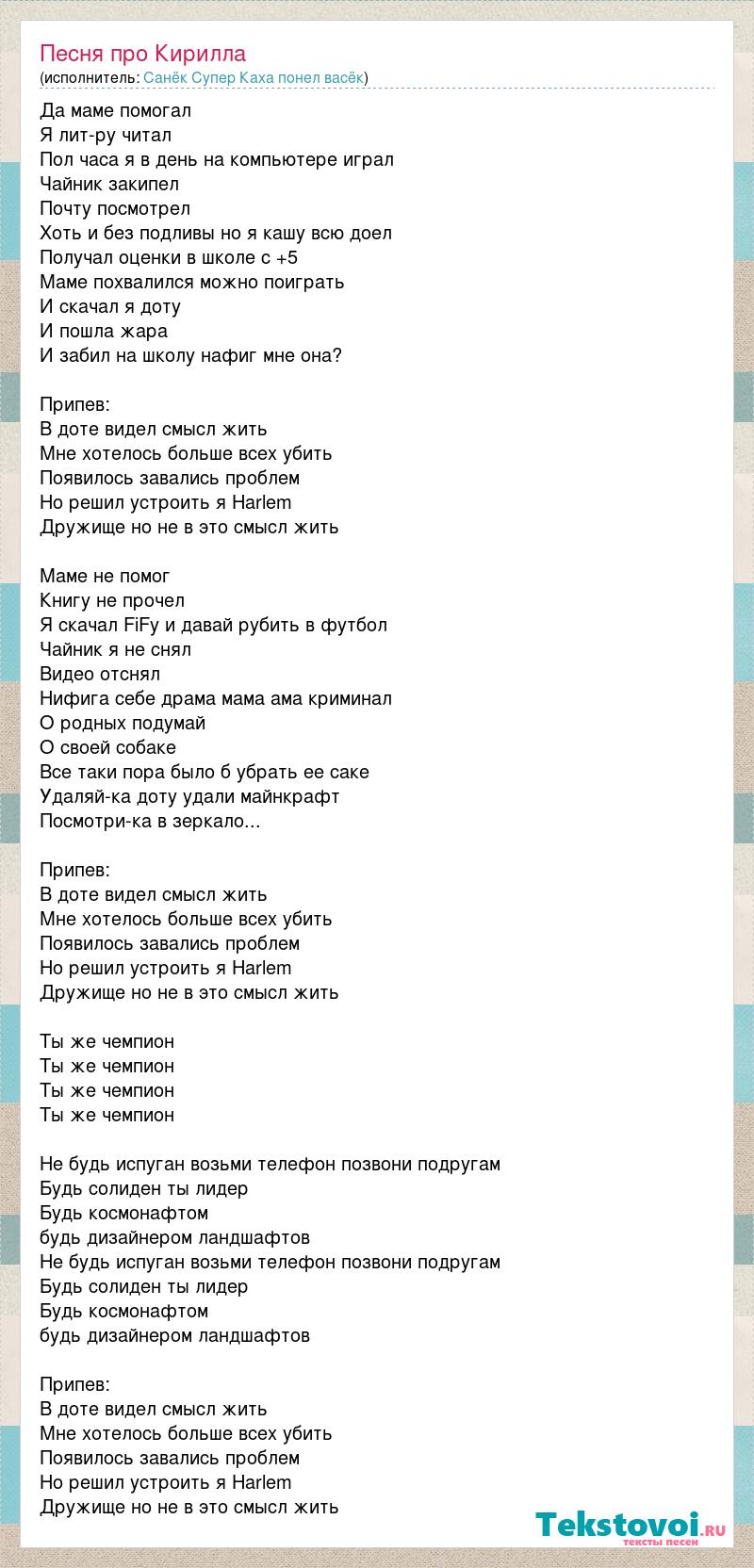 Да маме помогал Я лит-ру читал Пол часа я в день на компьютере играл Чайник закипел Почту посмотрел Хоть и без подливы но я кашу всю доел Получал оценки в школе с +5 Маме похвалился можно поиграть И скачал я доту И пошла жара И забил на школу нафиг мне она? Припев: В доте видел смысл жить Мне хотелось больше всех убить Появилось завались проблем Но решил устроить я Harlem Дружище но не в это смысл жить Маме не помог Книгу не прочел Я скачал FiFу и давай рубить в футбол Чайник я не снял Видео отснял Нифига себе драма мама ама криминал О родных подумай О своей собаке Все таки пора было б убрать ее саке Удаляй-ка доту удали майнкрафт Посмотри-ка в зеркало... Припев: В доте видел смысл жить Мне хотелось больше всех убить Появилось завались проблем Но решил устроить я Harlem Дружище но не в это смысл жить Ты же чемпион Ты же чемпион Ты же чемпион Ты же чемпион Не будь испуган возьми телефон позвони подругам Будь солиден ты лидер Будь космонафтом будь дизайнером ландшафтов Не будь испуган возьми телефон позвони подругам Будь солиден ты лидер Будь космонафтом будь дизайнером ландшафтов Припев: В доте видел смысл жить Мне хотелось больше всех убить Появилось завались проблем Но решил устроить я Harlem Дружище но не в это смысл жить