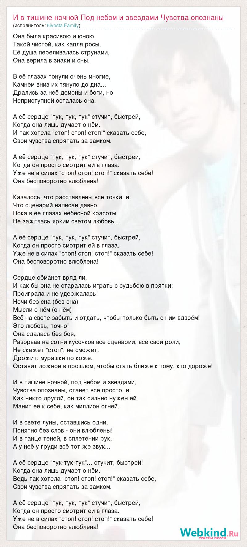 Она была красивою и юною, Такой чистой, как капля росы. Её душа переливалась струнами, Она верила в знаки и сны. В её глазах тонули очень многие, Камнем вниз их тянуло до дна... Дрались за неё демоны и боги, но Неприступной осталась она. А её сердце "тук, тук, тук" стучит, быстрей, Когда она лишь думает о нём. И так хотела "стоп! стоп! стоп!" сказать себе, Свои чувства спрятать за замком. А её сердце "тук, тук, тук" стучит, быстрей, Когда он просто смотрит ей в глаза. Уже не в силах "стоп! стоп! стоп!" сказать себе! Она бесповоротно влюблена! Казалось, что расставлены все точки, и Что сценарий написан давно. Пока в её глазах небесной красоты Не зажглась ярким светом любовь... А её сердце "тук, тук, тук" стучит, быстрей, Когда он просто смотрит ей в глаза. Уже не в силах "стоп! стоп! стоп!" сказать себе! Она бесповоротно влюблена! Сердце обманет вряд ли, И как бы она не старалась играть с судьбою в прятки: Проиграла и не удержалась! Ночи без сна (без сна) Мысли о нём (о нём) Всё на свете забыть и отдать, чтобы только быть с ним вдвоём! Это любовь, точно! Она сдалась без боя, Разорвав на сотни кусочков все сценарии, все свои роли, Не скажет "стоп", не сможет. Дрожит: мурашки по коже. Оставит ложное в прошлом, чтобы стать ближе к тому, кто дороже! И в тишине ночной, под небом и звёздами, Чувства опознаны, станет всё просто, и Как никто другой, он так сильно нужен ей. Манит её к себе, как миллион огней. И в свете луны, оставшись одни, Понятно без слов - они влюблены! И в танце теней, в сплетении рук, А у неё у груди всё тот же звук... А её сердце "тук-тук-тук"... стучит, быстрей! Когда она лишь думает о нём. Ведь так хотела "стоп! стоп! стоп!" сказать себе, Свои чувства спрятать за замком. А её сердце "тук, тук, тук" стучит, быстрей, Когда он просто смотрит ей в глаза. Уже не в силах "стоп! стоп! стоп!" сказать себе! Она бесповоротно влюблена!