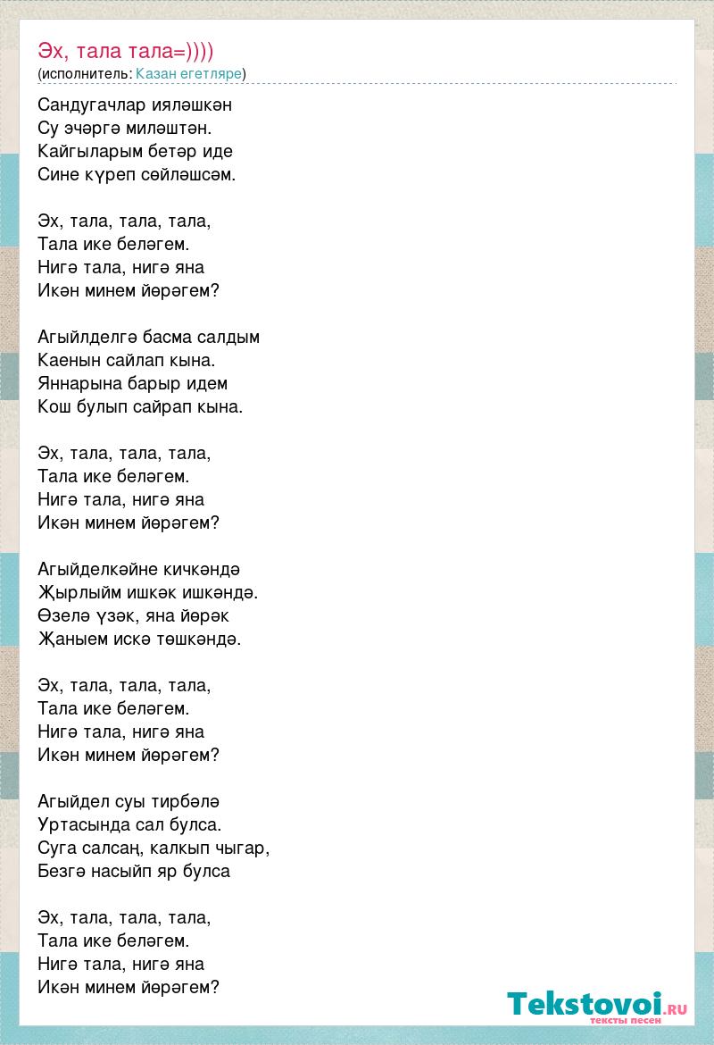 Сандугачлар ияләшкән Су эчәргә миләштән. Кайгыларым бетәр иде Сине күреп сөйләшсәм. Эх, тала, тала, тала, Тала ике беләгем. Нигә тала, нигә яна Икән минем йөрәгем? Агыйлделгә басма салдым Каенын сайлап кына. Яннарына барыр идем Кош булып сайрап кына. Эх, тала, тала, тала, Тала ике беләгем. Нигә тала, нигә яна Икән минем йөрәгем? Агыйделкәйне кичкәндә Җырлыйм ишкәк ишкәндә. Өзелә үзәк, яна йөрәк Җаныем искә төшкәндә. Эх, тала, тала, тала, Тала ике беләгем. Нигә тала, нигә яна Икән минем йөрәгем? Агыйдел суы тирбәлә Уртасында сал булса. Суга салсаң, калкып чыгар, Безгә насыйп яр булса Эх, тала, тала, тала, Тала ике беләгем. Нигә тала, нигә яна Икән минем йөрәгем?