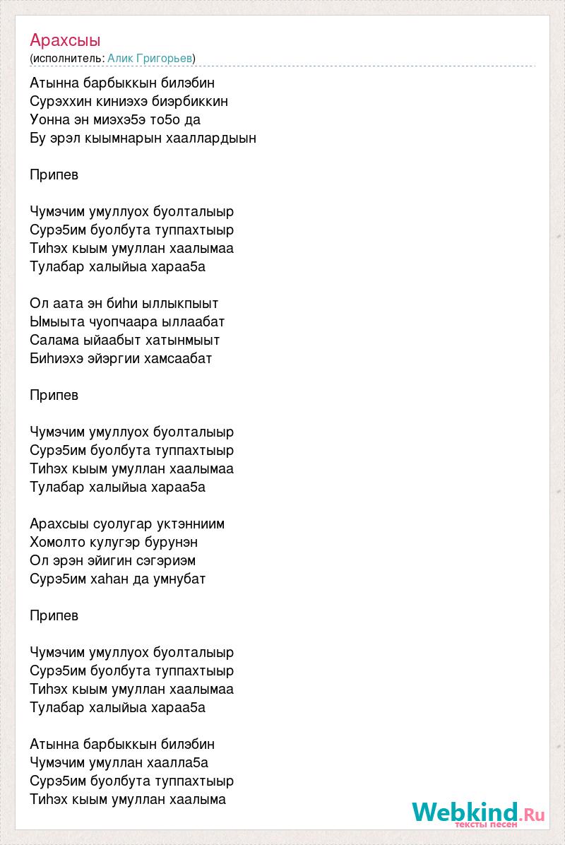 Атынна барбыккын билэбин Сурэххин киниэхэ биэрбиккин Уонна эн миэхэ5э то5о да Бу эрэл кыымнарын хааллардыын Припев Чумэчим умуллуох буолталыыр Сурэ5им буолбута туппахтыыр Тиhэх кыым умуллан хаалымаа Тулабар халыйыа хараа5а Ол аата эн биhи ыллыкпыыт Ымыыта чуопчаара ыллаабат Салама ыйаабыт хатынмыыт Биhиэхэ эйэргии хамсаабат Припев Чумэчим умуллуох буолталыыр Сурэ5им буолбута туппахтыыр Тиhэх кыым умуллан хаалымаа Тулабар халыйыа хараа5а Арахсыы суолугар уктэнниим Хомолто кулугэр бурунэн Ол эрэн эйигин сэгэриэм Сурэ5им хаhан да умнубат Припев Чумэчим умуллуох буолталыыр Сурэ5им буолбута туппахтыыр Тиhэх кыым умуллан хаалымаа Тулабар халыйыа хараа5а Атынна барбыккын билэбин Чумэчим умуллан хаалла5а Сурэ5им буолбута туппахтыыр Тиhэх кыым умуллан хаалыма