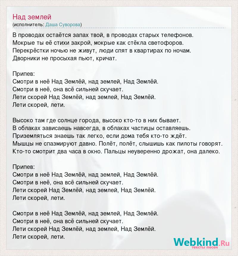 В проводах остаётся запах твой, в проводах старых телефонов. Мокрые ты её стихи закрой, мокрые как стёкла светофоров. Перекрёстки ночью не живут, люди спят в квартирах по ночам. Дворники не просыхая пьют, кричат. Припев: Смотри в неё Над Землёй, над землей, Над Землёй. Смотри в неё, она всё сильней скучает. Лети скорей Над Землёй, над землей, Над Землёй. Лети скорей, лети. Высоко там где солнце города, высоко кто-то в них бывает. В облаках зависаешь навсегда, в облаках частицы оставляешь. Приземляться знаешь так легко, если дома тебя кто-то ждёт. Мышцы не спазмируют давно. Полёт, полёт, слышишь как пилоты говорят. Кто-то смотрит два часа в окно. Пальцы неуверенно дрожат, она далеко. Припев: Смотри в неё Над Землёй, над землей, Над Землёй. Смотри в неё, она всё сильней скучает. Лети скорей Над Землёй, над землей, Над Землёй. Лети скорей, лети. Смотри в неё Над Землёй, над землей, Над Землёй. Смотри в неё, она всё сильней скучает. Лети скорей Над Землёй, над землей, Над Землёй. Лети скорей, лети.