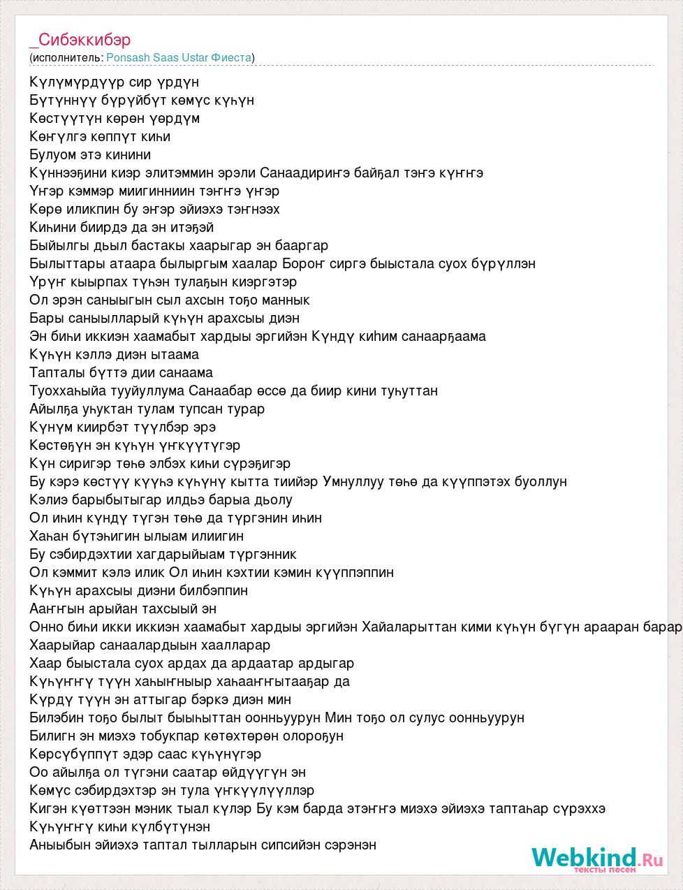 Күлүмүрдүүр сир үрдүн Бүтүннүү бүрүйбүт көмүс күһүн Көстүүтүн көрөн үөрдүм Көҥүлгэ көппүт киһи Булуом этэ кинини Күннээҕини киэр элитэммин эрэли Санаадириҥэ байҕал тэҥэ күҥҥэ Үҥэр кэммэр миигинниин тэҥҥэ үҥэр Көрө иликпин бу эҥэр эйиэхэ тэҥнээх Киһини биирдэ да эн итэҕэй Быйылгы дьыл бастакы хаарыгар эн бааргар Былыттары атаара былыргым хаалар Бороҥ сиргэ быыстала суох бүрүллэн Үрүҥ кыырпах түһэн тулаҕын киэргэтэр Ол эрэн саныыгын сыл ахсын тоҕо маннык Бары саныылларый күһүн арахсыы диэн Эн биһи иккиэн хаамабыт хардыы эргийэн Күндү киhим санаарҕаама Күһүн кэллэ диэн ытаама Тапталы бүттэ дии санаама Туоххаһыйа тууйуллума Санаабар өссө да биир кини туһуттан Айылҕа уһуктан тулам тупсан турар Күнүм киирбэт түүлбэр эрэ Көстөҕүн эн күһүн үҥкүүтүгэр Күн сиригэр төһө элбэх киһи сүрэҕигэр Бу кэрэ көстүү күүһэ күһүнү кытта тиийэр Умнуллуу төһө да күүппэтэх буоллун Кэлиэ барыбытыгар илдьэ барыа дьолу Ол иһин күндү түгэн төһө да түргэнин иһин Хаһан бүтэһигин ылыам илиигин Бу сэбирдэхтии хагдарыйыам түргэнник Ол кэммит кэлэ илик Ол иһин кэхтии кэмин күүппэппин Күһүн арахсыы диэни билбэппин Ааҥҥын арыйан тахсыый эн Онно биһи икки иккиэн хаамабыт хардыы эргийэн Хайаларыттан кими күһүн бүгүн арааран барар Хаарыйар санаалардыын хаалларар Хаар быыстала суох ардах да ардаатар ардыгар Күһүҥҥү түүн хаһыҥныыр хаһааҥҥытааҕар да Күрдү түүн эн аттыгар бэркэ диэн мин Билэбин тоҕо былыт быыһыттан оонньуурун Мин тоҕо ол сулус оонньуурун Билигн эн миэхэ тобукпар көтөхтөрөн олороҕун Көрсүбүппүт эдэр саас күһүнүгэр Оо айылҕа ол түгэни саатар өйдүүгүн эн Көмүс сэбирдэхтэр эн тула үҥкүүлүүллэр Кигэн күөттээн мэник тыал күлэр Бу кэм барда этэҥҥэ миэхэ эйиэхэ таптаһар сүрэххэ Күһүҥҥү киһи күлбүтүнэн Аныыбын эйиэхэ таптал тылларын сипсийэн сэрэнэн