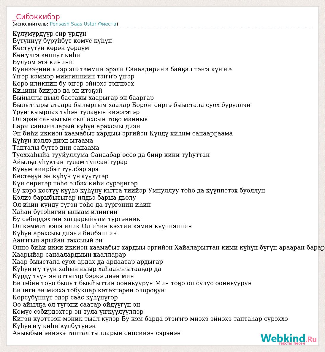 Күлүмүрдүүр сир үрдүн Бүтүннүү бүрүйбүт көмүс күһүн Көстүүтүн көрөн үөрдүм Көҥүлгэ көппүт киһи Булуом этэ кинини Күннээҕини киэр элитэммин эрэли Санаадириҥэ байҕал тэҥэ күҥҥэ Үҥэр кэммэр миигинниин тэҥҥэ үҥэр Көрө иликпин бу эҥэр эйиэхэ тэҥнээх Киһини биирдэ да эн итэҕэй Быйылгы дьыл бастакы хаарыгар эн бааргар Былыттары атаара былыргым хаалар Бороҥ сиргэ быыстала суох бүрүллэн Үрүҥ кыырпах түһэн тулаҕын киэргэтэр Ол эрэн саныыгын сыл ахсын тоҕо маннык Бары саныылларый күһүн арахсыы диэн Эн биһи иккиэн хаамабыт хардыы эргийэн Күндү киhим санаарҕаама Күһүн кэллэ диэн ытаама Тапталы бүттэ дии санаама Туоххаһыйа тууйуллума Санаабар өссө да биир кини туһуттан Айылҕа уһуктан тулам тупсан турар Күнүм киирбэт түүлбэр эрэ Көстөҕүн эн күһүн үҥкүүтүгэр Күн сиригэр төһө элбэх киһи сүрэҕигэр Бу кэрэ көстүү күүһэ күһүнү кытта тиийэр Умнуллуу төһө да күүппэтэх буоллун Кэлиэ барыбытыгар илдьэ барыа дьолу Ол иһин күндү түгэн төһө да түргэнин иһин Хаһан бүтэһигин ылыам илиигин Бу сэбирдэхтии хагдарыйыам түргэнник Ол кэммит кэлэ илик Ол иһин кэхтии кэмин күүппэппин Күһүн арахсыы диэни билбэппин Ааҥҥын арыйан тахсыый эн Онно биһи икки иккиэн хаамабыт хардыы эргийэн Хайаларыттан кими күһүн бүгүн арааран барар Хаарыйар санаалардыын хаалларар Хаар быыстала суох ардах да ардаатар ардыгар Күһүҥҥү түүн хаһыҥныыр хаһааҥҥытааҕар да Күрдү түүн эн аттыгар бэркэ диэн мин Билэбин тоҕо былыт быыһыттан оонньуурун Мин тоҕо ол сулус оонньуурун Билигн эн миэхэ тобукпар көтөхтөрөн олороҕун Көрсүбүппүт эдэр саас күһүнүгэр Оо айылҕа ол түгэни саатар өйдүүгүн эн Көмүс сэбирдэхтэр эн тула үҥкүүлүүллэр Кигэн күөттээн мэник тыал күлэр Бу кэм барда этэҥҥэ миэхэ эйиэхэ таптаһар сүрэххэ Күһүҥҥү киһи күлбүтүнэн Аныыбын эйиэхэ таптал тылларын сипсийэн сэрэнэн