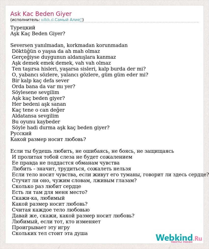 Турецкий Aşk Kaç Beden Giyer? Seversen yanılmadan, korkmadan korunmadan Döktüğün o yaşsa da ah mah olmaz Gerçeğiyse duygunun aldanışlara kanmaz Aşk demek emek demek, vah vah olmaz Ten taşırsa hisleri, yaşarsa sisleri, kalp burda der mi? O, yabancı sözlere, yalancı gözlere, güm güm eder mi? Bir kalp kaç defa sever Orda bana da var mı yer? Söylesene sevgilim Aşk kaç beden giyer? Her bedeni aşk sanan Kaç tene o can değer Aldatansa sevgilim Bu oyunu kaybeder Söyle hadi durma aşk kaç beden giyer? Русский Какой размер носит любовь? Если ты будешь любить, не ошибаясь, не боясь, не защищаясь И пролитая тобой слеза не будет сожалением Ее правда не поддастся обманам чувства Любить - значит, трудиться, сожалеть нельзя Если тело носит чувства, если живут его туманы, говорит ли здесь сердце? Стучит ли оно, чужим словам, лживым глазам? Сколько раз любит сердце Есть ли там для меня место? Скажи-ка, любимый Какой размер носит любовь? Считая каждое тело любовью Давай же, скажи, какой размер носит любовь? Любимый, если тот, кто изменяет Проигрывает эту игру Скольких тел стоит эта душа