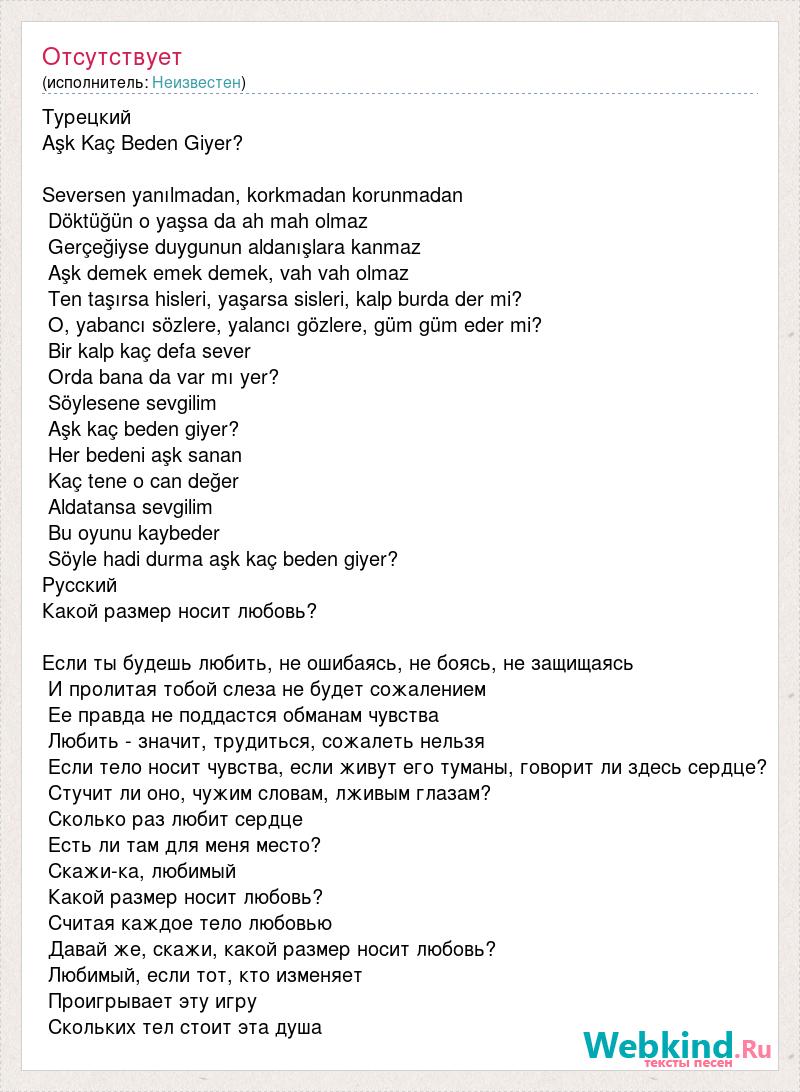 Турецкий Aşk Kaç Beden Giyer? Seversen yanılmadan, korkmadan korunmadan Döktüğün o yaşsa da ah mah olmaz Gerçeğiyse duygunun aldanışlara kanmaz Aşk demek emek demek, vah vah olmaz Ten taşırsa hisleri, yaşarsa sisleri, kalp burda der mi? O, yabancı sözlere, yalancı gözlere, güm güm eder mi? Bir kalp kaç defa sever Orda bana da var mı yer? Söylesene sevgilim Aşk kaç beden giyer? Her bedeni aşk sanan Kaç tene o can değer Aldatansa sevgilim Bu oyunu kaybeder Söyle hadi durma aşk kaç beden giyer? Русский Какой размер носит любовь? Если ты будешь любить, не ошибаясь, не боясь, не защищаясь И пролитая тобой слеза не будет сожалением Ее правда не поддастся обманам чувства Любить - значит, трудиться, сожалеть нельзя Если тело носит чувства, если живут его туманы, говорит ли здесь сердце? Стучит ли оно, чужим словам, лживым глазам? Сколько раз любит сердце Есть ли там для меня место? Скажи-ка, любимый Какой размер носит любовь? Считая каждое тело любовью Давай же, скажи, какой размер носит любовь? Любимый, если тот, кто изменяет Проигрывает эту игру Скольких тел стоит эта душа