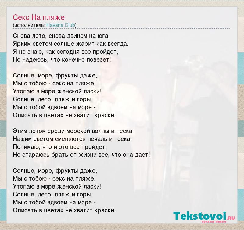 Снова лето, снова двинем на юга, Ярким светом солнце жарит как всегда. Я не знаю, как сегодня все пройдет, Но надеюсь, что конечно повезет! Солнце, море, фрукты даже, Мы с тобою - секс на пляже, Утопаю в море женской ласки! Солнце, лето, пляж и горы, Мы с тобой вдвоем на море - Описать в цветах не хватит краски. Этим летом среди морской волны и песка Нашим светом сменяются печаль и тоска. Понимаю, что и это все пройдет, Но стараюсь брать от жизни все, что она дает! Солнце, море, фрукты даже, Мы с тобою - секс на пляже, Утопаю в море женской ласки! Солнце, лето, пляж и горы, Мы с тобой вдвоем на море - Описать в цветах не хватит краски.