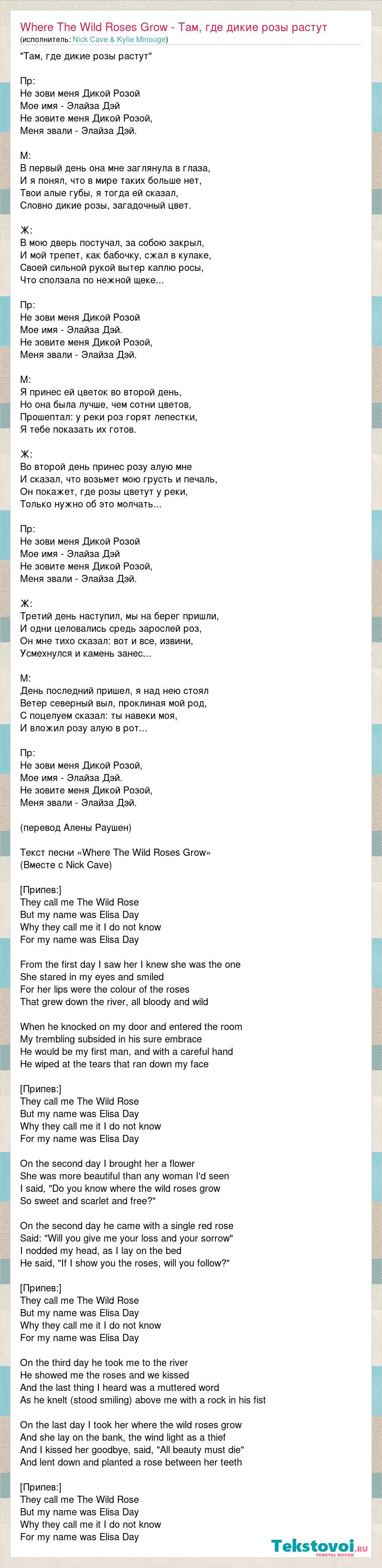 "Там, где дикие розы растут" Пр: Не зови меня Дикой Розой Мое имя - Элайза Дэй Не зовите меня Дикой Розой, Меня звали - Элайза Дэй. М: В первый день она мне заглянула в глаза, И я понял, что в мире таких больше нет, Твои алые губы, я тогда ей сказал, Словно дикие розы, загадочный цвет. Ж: В мою дверь постучал, за собою закрыл, И мой трепет, как бабочку, сжал в кулаке, Своей сильной рукой вытер каплю росы, Что сползала по нежной щеке... Пр: Не зови меня Дикой Розой Мое имя - Элайза Дэй. Не зовите меня Дикой Розой, Меня звали - Элайза Дэй. М: Я принес ей цветок во второй день, Но она была лучше, чем сотни цветов, Прошептал: у реки роз горят лепестки, Я тебе показать их готов. Ж: Во второй день принес розу алую мне И сказал, что возьмет мою грусть и печаль, Он покажет, где розы цветут у реки, Только нужно об это молчать... Пр: Не зови меня Дикой Розой Мое имя - Элайза Дэй Не зовите меня Дикой Розой, Меня звали - Элайза Дэй. Ж: Третий день наступил, мы на берег пришли, И одни целовались средь зарослей роз, Он мне тихо сказал: вот и все, извини, Усмехнулся и камень занес... М: День последний пришел, я над нею стоял Ветер северный выл, проклиная мой род, С поцелуем сказал: ты навеки моя, И вложил розу алую в рот... Пр: Не зови меня Дикой Розой, Мое имя - Элайза Дэй. Не зовите меня Дикой Розой, Меня звали - Элайза Дэй. (перевод Алены Раушен) Текст песни «Where The Wild Roses Grow» (Вместе с Nick Cave) [Припев:] They call me The Wild Rose But my name was Elisa Day Why they call me it I do not know For my name was Elisa Day From the first day I saw her I knew she was the one She stared in my eyes and smiled For her lips were the colour of the roses That grew down the river, all bloody and wild When he knocked on my door and entered the room My trembling subsided in his sure embrace He would be my first man, and with a careful hand He wiped at the tears that ran down my face [Припев:] They call me The Wild Rose But my name was Elisa Day Why they call me it I do not know For my name was Elisa Day On the second day I brought her a flower She was more beautiful than any woman I'd seen I said, "Do you know where the wild roses grow So sweet and scarlet and free?" On the second day he came with a single red rose Said: "Will you give me your loss and your sorrow" I nodded my head, as I lay on the bed He said, "If I show you the roses, will you follow?" [Припев:] They call me The Wild Rose But my name was Elisa Day Why they call me it I do not know For my name was Elisa Day On the third day he took me to the river He showed me the roses and we kissed And the last thing I heard was a muttered word As he knelt (stood smiling) above me with a rock in his fist On the last day I took her where the wild roses grow And she lay on the bank, the wind light as a thief And I kissed her goodbye, said, "All beauty must die" And lent down and planted a rose between her teeth [Припев:] They call me The Wild Rose But my name was Elisa Day Why they call me it I do not know For my name was Elisa Day