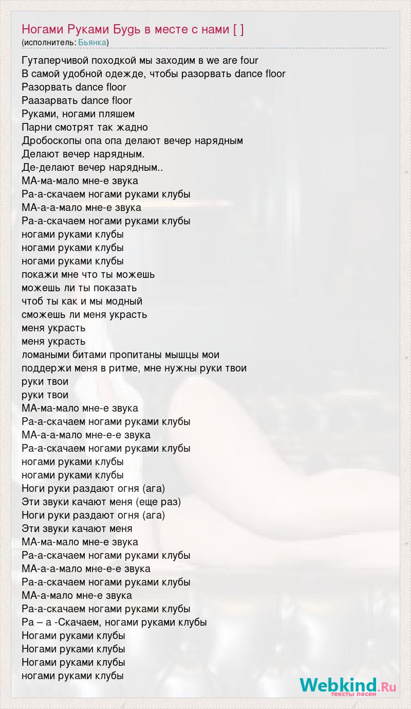Гутаперчивой походкой мы заходим в we are four В самой удобной одежде, чтобы разорвать dance floor Разорвать dance floor Раазарвать dance floor Руками, ногами пляшем Парни смотрят так жадно Дробоскопы опа опа делают вечер нарядным Делают вечер нарядным. Де-делают вечер нарядным.. МА-ма-мало мне-е звука Ра-а-скачаем ногами руками клубы МА-а-а-мало мне-е звука Ра-а-скачаем ногами руками клубы ногами руками клубы ногами руками клубы ногами руками клубы покажи мне что ты можешь можешь ли ты показать чтоб ты как и мы модный сможешь ли меня украсть меня украсть меня украсть ломаными битами пропитаны мышцы мои поддержи меня в ритме, мне нужны руки твои руки твои руки твои МА-ма-мало мне-е звука Ра-а-скачаем ногами руками клубы МА-а-а-мало мне-е-е звука Ра-а-скачаем ногами руками клубы ногами руками клубы ногами руками клубы Ноги руки раздают огня (ага) Эти звуки качают меня (еще раз) Ноги руки раздают огня (ага) Эти звуки качают меня МА-ма-мало мне-е звука Ра-а-скачаем ногами руками клубы МА-а-а-мало мне-е-е звука Ра-а-скачаем ногами руками клубы МА-а-мало мне-е звука Ра-а-скачаем ногами руками клубы Ра – а -Скачаем, ногами руками клубы Ногами руками клубы Ногами руками клубы Ногами руками клубы ногами руками клубы