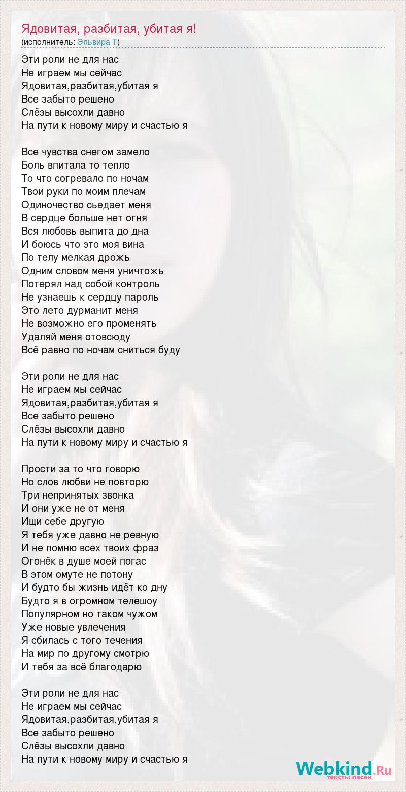Эти роли не для нас Не играем мы сейчас Ядовитая,разбитая,убитая я Все забыто решено Слёзы высохли давно На пути к новому миру и счастью я Все чувства снегом замело Боль впитала то тепло То что согревало по ночам Твои руки по моим плечам Одиночество сьедает меня В сердце больше нет огня Вся любовь выпита до дна И боюсь что это моя вина По телу мелкая дрожь Одним словом меня уничтожь Потерял над собой контроль Не узнаешь к сердцу пароль Это лето дурманит меня Не возможно его променять Удаляй меня отовсюду Всё равно по ночам сниться буду Эти роли не для нас Не играем мы сейчас Ядовитая,разбитая,убитая я Все забыто решено Слёзы высохли давно На пути к новому миру и счастью я Прости за то что говорю Но слов любви не повторю Три непринятых звонка И они уже не от меня Ищи себе другую Я тебя уже давно не ревную И не помню всех твоих фраз Огонёк в душе моей погас В этом омуте не потону И будто бы жизнь идёт ко дну Будто я в огромном телешоу Популярном но таком чужом Уже новые увлечения Я сбилась с того течения На мир по другому смотрю И тебя за всё благодарю Эти роли не для нас Не играем мы сейчас Ядовитая,разбитая,убитая я Все забыто решено Слёзы высохли давно На пути к новому миру и счастью я