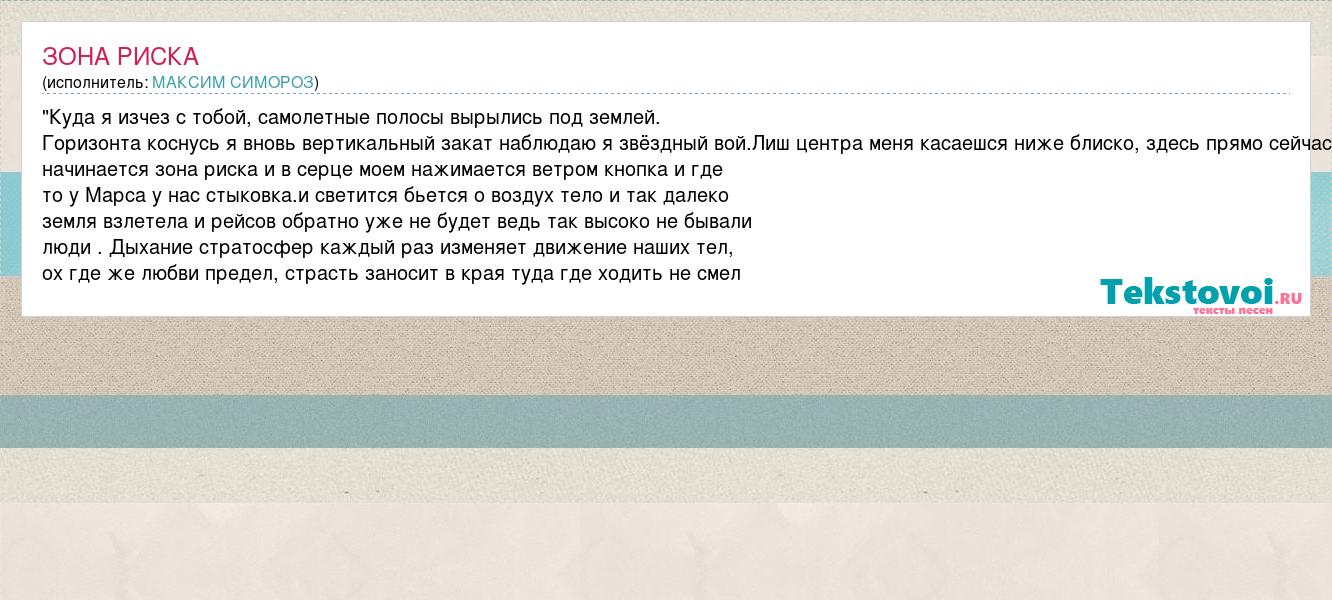 "Куда я изчез с тобой, самолетные полосы вырылись под землей. Горизонта коснусь я вновь вертикальный закат наблюдаю я звёздный вой.Лиш центра меня касаешся ниже блиско, здесь прямо сейчас начинается зона риска и в серце моем нажимается ветром кнопка и где то у Марса у нас стыковка.и светится бьется о воздух тело и так далеко земля взлетела и рейсов обратно уже не будет ведь так высоко не бывали люди . Дыхание стратосфер каждый раз изменяет движение наших тел, ох где же любви предел, страсть заносит в края туда где ходить не смел
