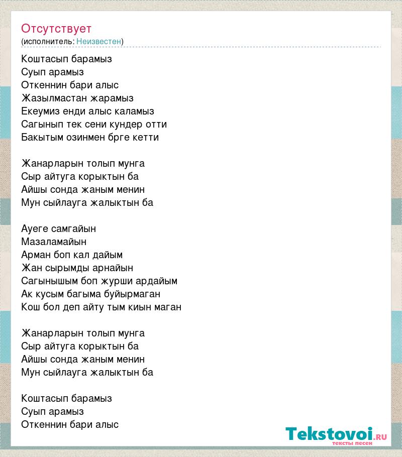 Коштасып барамыз Суып арамыз Откеннин бари алыс Жазылмастан жарамыз Екеумиз енди алыс каламыз Сагынып тек сени кундер отти Бакытым озинмен брге кетти Жанарларын толып мунга Сыр айтуга корыктын ба Айшы сонда жаным менин Мун сыйлауга жалыктын ба Ауеге самгайын Мазаламайын Арман боп кал дайым Жан сырымды арнайын Сагынышым боп журши ардайым Ак кусым багыма буйырмаган Кош бол деп айту тым киын маган Жанарларын толып мунга Сыр айтуга корыктын ба Айшы сонда жаным менин Мун сыйлауга жалыктын ба Коштасып барамыз Суып арамыз Откеннин бари алыс