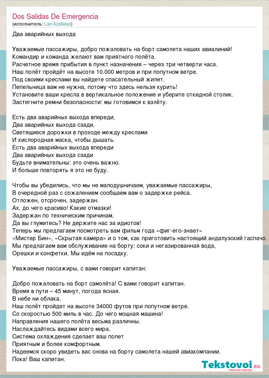 Два аварийных выхода Уважаемые пассажиры, добро пожаловать на борт самолета наших авиалиний! Командир и команда желают вам приятного полёта. Расчетное время прибытия в пункт назначения – через три четверти часа. Наш полёт пройдёт на высоте 10.000 метров и при попутном ветре. Под своими креслами вы найдете спасательный жилет. Пепельница вам не нужна, потому что здесь нельзя курить! Установите ваши кресла в вертикальное положение и уберите откидной столик. Застегните ремни безопасности: мы готовимся к взлёту. Есть два аварийных выхода впереди, Два аварийных выхода сзади. Светящиеся дорожки в проходе между креслами И кислородная маска, чтобы дышать. Есть два аварийных выхода впереди Два аварийных выхода сзади Будьте внимательны: это очень важно. И больше повторять я это не буду. Чтобы вы убедились, что мы не малодушничаем, уважаемые пассажиры, В очередной раз с сожалением сообщаем вам о задержке рейса. Отложен, отсрочен, задержан. Ах, до чего красиво! Какие отмазки! Задержан по техническим причинам. Да вы глумитесь? Не держите нас за идиотов! Теперь мы предлагаем посмотреть вам фильм года «фиг-его-знает» «Мистер Бин», «Скрытая камера» и о том, как приготовить настоящий андалузский гаспачо. Мы предлагаем вам обслуживание на борту: соки и негазированная вода, Орешки и конфетки. Мы идём на посадку. Уважаемые пассажиры, с вами говорит капитан: Добро пожаловать на борт самолёта! С вами говорит капитан. Время в пути – 45 минут, погода ясная. В небе ни облака. Наш полёт пройдет на высоте 34000 футов при попутном ветре. Со скоростью 500 миль в час. До чего мощная машина! Направления нашего полёта весьма различны. Наслаждайтесь видами всего мира. Система охлаждения сделает ваш полет Приятным и более комфортным. Надеемся скоро увидеть вас снова на борту самолета нашей авиакомпании. Пока! Ваш капитан.