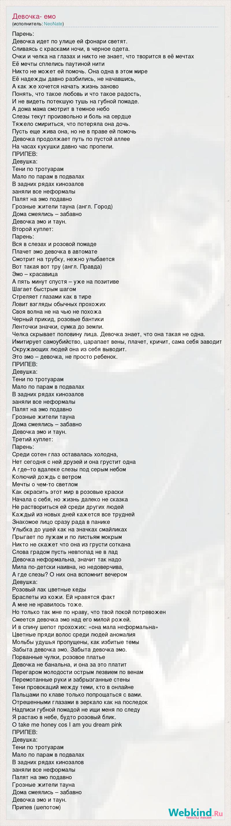 Парень: Девочка идет по улице ей фонари светят. Сливаясь с красками ночи, в черное одета. Очки и челка на глазах и никто не знает, что творится в её мечтах Её мечты сплелись паутиной нити Никто не может ей помочь. Она одна в этом мире Её надежды давно разбились, не начавшись, А как же хочется начать жизнь заново Понять, что такое любовь и что такое радость, И не видеть потекшую тушь на губной помаде. А дома мама смотрит в темное небо Слезы текут произвольно и боль на сердце Тяжело смириться, что потеряла она дочь. Пусть еще жива она, но не в праве ей помочь Девочка продолжает путь по пустой аллее На часах кукушки давно час пропели. ПРИПЕВ: Девушка: Тени по тротуарам Мало по парам в подвалах В задних рядах кинозалов заняли все неформалы Палят на эмо подавно Грозные жители тауна (англ. Город) Дома смеялись – забавно Девочка эмо и таун. Второй куплет: Парень: Вся в слезах и розовой помаде Плачет эмо девочка в автомате Смотрит на трубку, нежно улыбается Вот такая вот тру (англ. Правда) Эмо – красавица А пять минут спустя – уже на позитиве Шагает быстрым шагом Стреляет глазами как в тире Ловит взгляды обычных прохожих Своя волна не на чью не похожа Черный прикид, розовые бантики Ленточки значки, сумка до земли. Челка скрывает половину лица. Девочка знает, что она такая не одна. Имитирует самоубийство, царапает вены, плачет, кричит, сама себя заводит Окружающих людей она из себя выводит. Это эмо – девочка, не просто ребенок. ПРИПЕВ: Девушка: Тени по тротуарам Мало по парам в подвалах В задних рядах кинозалов заняли все неформалы Палят на эмо подавно Грозные жители тауна Дома смеялись – забавно Девочка эмо и таун. Третий куплет: Парень: Среди сотен глаз оставалась холодна, Нет сегодня с ней друзей и она грустит одна А где–то вдалеке слезы под серым небом Колючий дождь с ветром Мечты о чем-то светлом Как окрасить этот мир в розовые краски Начала с себя, но жизнь далеко не сказка Не раствориться ей среди других людей Каждый из новых дней кажется все трудней Знакомое лицо сразу рада в панике Улыбка до ушей как на значках смайликах Прыгает по лужам и по листьям мокрым Никто не скажет что она из грусти соткана Слова градом пусть невпопад не в лад Девочка неформальна, значит так надо Мила по-детски наивна, но недоверчива, А где слезы? О них она вспомнит вечером Девушка: Розовый лак цветные кеды Браслеты из кожи. Ей нравятся факт А мне не нравилось тоже. Но только так мне по нраву, что твой покой потревожен Смеется девочка эмо над его милой рожей. И в спину шепот прохожих: «она мала неформальна» Цветные пряди волос среди людей аномалия Мольбы удушья пропущены, как избитые темы Забыта девочка эмо. Забыта девочка эмо. Порванные чулки, розовое платье Девочка не банальна, и она за это платит Перегаром молодости острым лезвием по венам Перемотанные руки и забрызганные стены Тени провокаций между теми, кто в онлайне Пальцами по клаве только попрощаться с вами. Отрешенными глазами в зеркало как на последок Надписи губной помадой не ищи меня по следу Я растаю в небе, будто розовый блик. О take me honey cos I am you dream pink ПРИПЕВ: Девушка: Тени по тротуарам Мало по парам в подвалах В задних рядах кинозалов заняли все неформалы Палят на эмо подавно Грозные жители тауна Дома смеялись – забавно Девочка эмо и таун. Припев (шепотом)