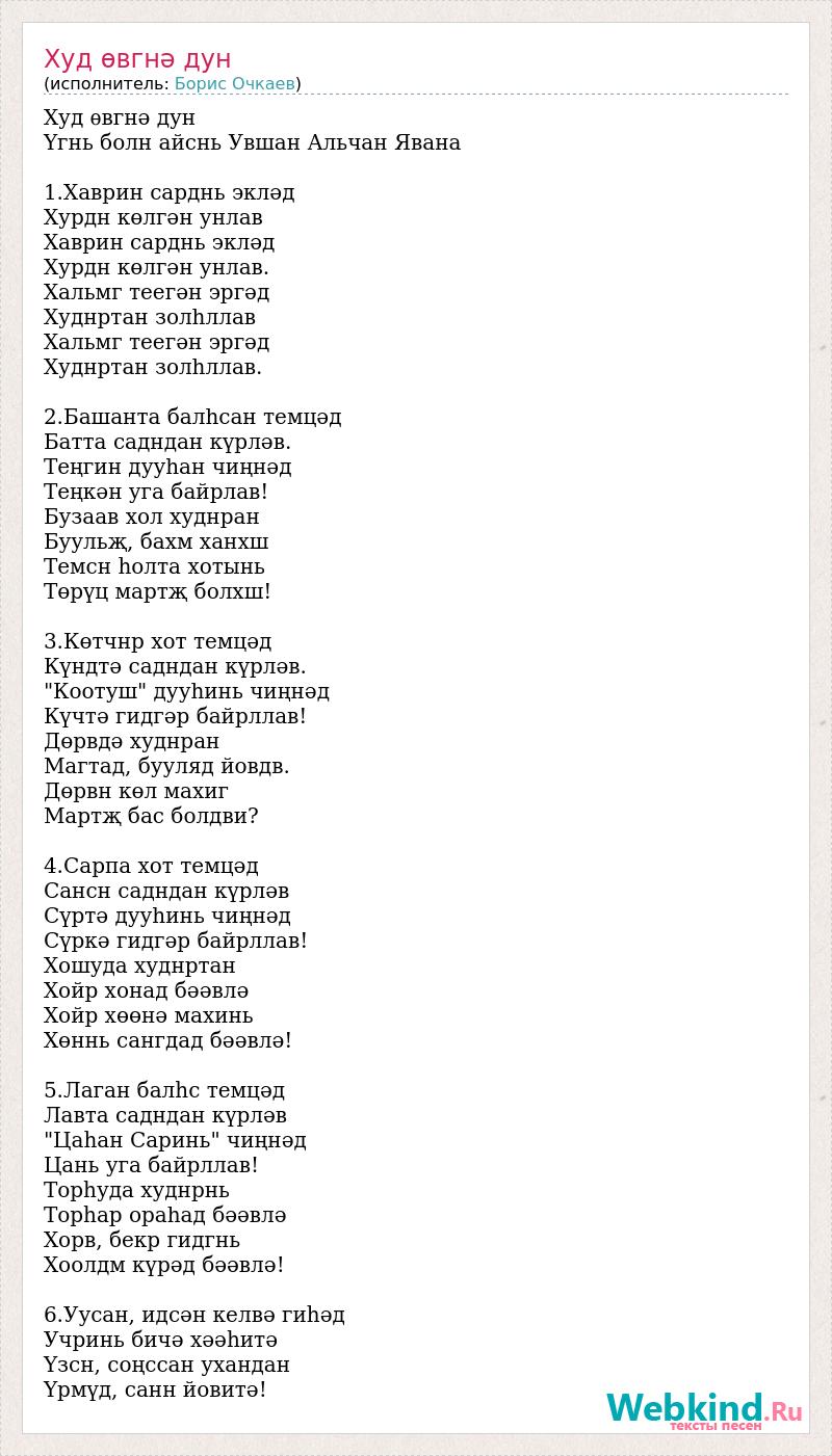 Худ ѳвгнә дун Үгнь болн айснь Увшан Альчан Явана 1.Хаврин сарднь экләд Хурдн көлгән унлав Хаврин сарднь экләд Хурдн көлгән унлав. Хальмг теегән эргәд Худнртан золhллав Хальмг теегән эргәд Худнртан золhллав. 2.Башанта балhсан темцәд Батта садндан күрләв. Теңгин дууhан чиңнәд Теңкән уга байрлав! Бузаав хол худнран Буульҗ, бахм ханхш Темсн һолта хотынь Төрүц мартҗ болхш! 3.Көтчнр хот темцәд Күндтә садндан күрләв. "Коотуш" дууhинь чиңнәд Күчтә гидгәр байрллав! Дөрвдә худнран Магтад, бууляд йовдв. Дөрвн көл махиг Мартҗ бас болдви? 4.Сарпа хот темцәд Сансн садндан күрләв Сүртә дууhинь чиңнәд Сүркә гидгәр байрллав! Хошуда худнртан Хойр хонад бәәвлә Хойр хөөнә махинь Хөннь сангдад бәәвлә! 5.Лаган балһс темцәд Лавта садндан күрләв "Цаһан Саринь" чиңнәд Цань уга байрллав! Торһуда худнрнь Торһар ораhад бәәвлә Хорв, бекр гидгнь Хоолдм күрәд бәәвлә! 6.Уусан, идсән келвә гиһәд Учринь бичә хәәһитә Үзсн, соңссан ухандан Үрмүд, санн йовитә!