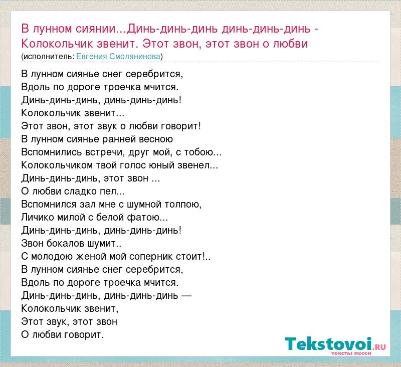 В лунном сиянье снег серебрится, Вдоль по дороге троечка мчится. Динь-динь-динь, динь-динь-динь! Колокольчик звенит... Этот звон, этот звук о любви говорит! В лунном сиянье ранней весною Вспомнились встречи, друг мой, с тобою... Колокольчиком твой голос юный звенел... Динь-динь-динь, этот звон ... О любви сладко пел... Вспомнился зал мне с шумной толпою, Личико милой с белой фатою... Динь-динь-динь, динь-динь-динь! Звон бокалов шумит.. С молодою женой мой соперник стоит!.. В лунном сиянье снег серебрится, Вдоль по дороге троечка мчится. Динь-динь-динь, динь-динь-динь — Колокольчик звенит, Этот звук, этот звон О любви говорит.