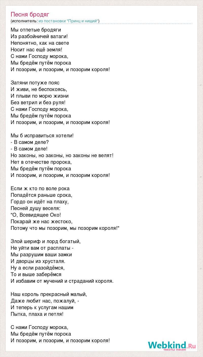 Мы отпетые бродяги Из разбойничей ватаги! Непонятно, как на свете Носит нас ещё земля! С нами Господу морока, Мы бредём путём порока И позорим, и позорим, и позорим короля! Затяни потуже пояс И живи, не беспокоясь, И плыви по морю жизни Без ветрил и без руля! С нами Господу морока, Мы бредём путём порока И позорим, и позорим, и позорим короля! Мы б исправиться хотели! - В самом деле? - В самом деле! Но законы, но законы, но законы не велят! Нет в отечестве пророка, Мы бредём путём порока И позорим, и позорим, и позорим короля! Если ж кто по воле рока Попадётся раньше срока, Гордо он идёт на плаху, Песней душу веселя: "О, Всевидящее Око! Покарай же нас жестоко, Потому что мы позорим, мы позорим короля!" Злой шериф и лорд богатый, Не уйти вам от расплаты - Мы разрушим ваши замки И дворцы из хрусталя. Ну а если разойдёмся, То и выше заберёмся И избавим от мучений и страданий короля. Наш король прекрасный малый, Даже любит нас, пожалуй, - И теперь к услугам нашим Пытка, плаха и петля! С нами Господу морока, Мы бредём путём порока И позорим, и позорим, и позорим короля!