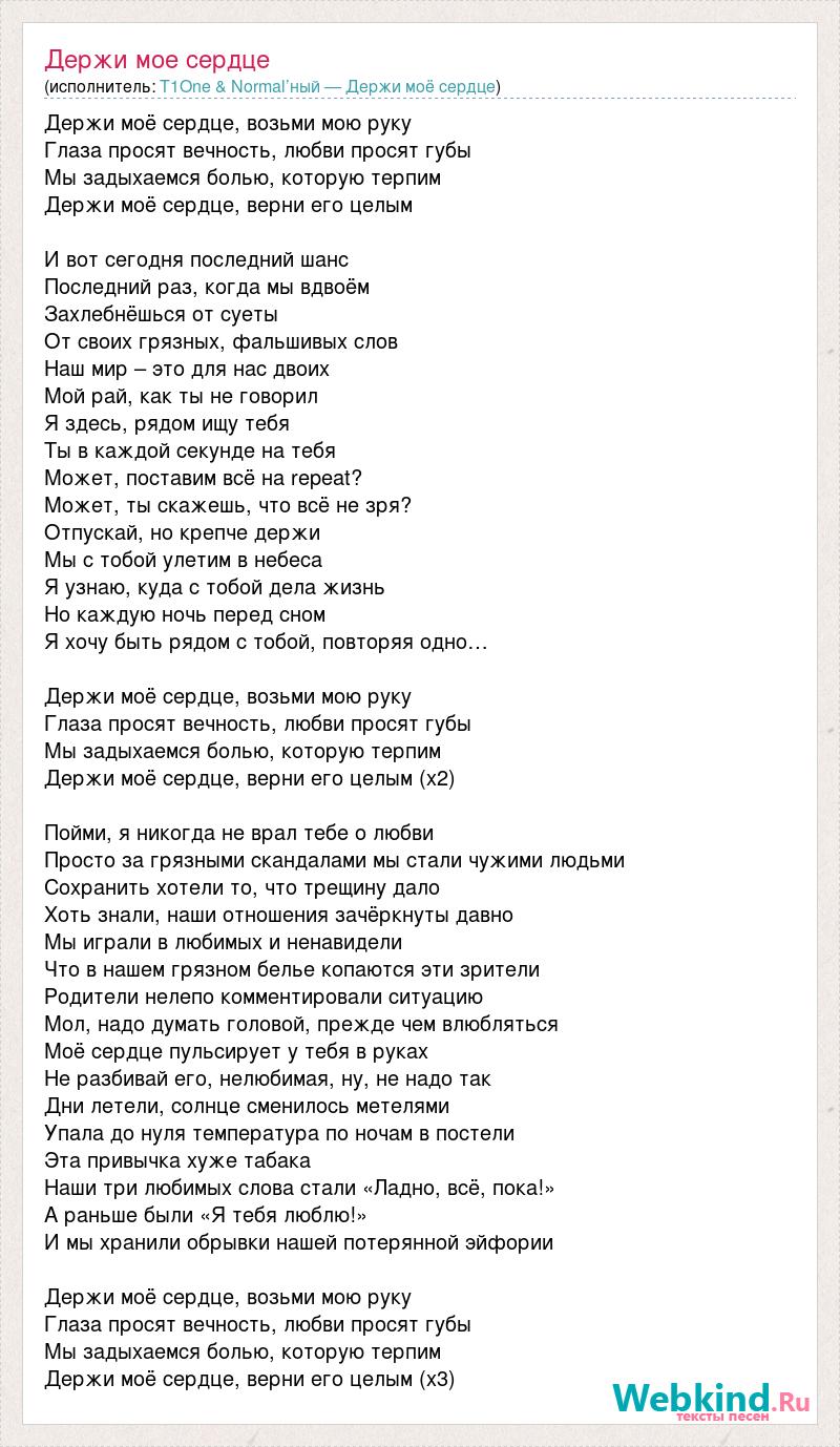 Держи моё сердце, возьми мою руку Глаза просят вечность, любви просят губы Мы задыхаемся болью, которую терпим Держи моё сердце, верни его целым И вот сегодня последний шанс Последний раз, когда мы вдвоём Захлебнёшься от суеты От своих грязных, фальшивых слов Наш мир – это для нас двоих Мой рай, как ты не говорил Я здесь, рядом ищу тебя Ты в каждой секунде на тебя Может, поставим всё на repeat? Может, ты скажешь, что всё не зря? Отпускай, но крепче держи Мы с тобой улетим в небеса Я узнаю, куда с тобой дела жизнь Но каждую ночь перед сном Я хочу быть рядом с тобой, повторяя одно… Держи моё сердце, возьми мою руку Глаза просят вечность, любви просят губы Мы задыхаемся болью, которую терпим Держи моё сердце, верни его целым (х2) Пойми, я никогда не врал тебе о любви Просто за грязными скандалами мы стали чужими людьми Сохранить хотели то, что трещину дало Хоть знали, наши отношения зачёркнуты давно Мы играли в любимых и ненавидели Что в нашем грязном белье копаются эти зрители Родители нелепо комментировали ситуацию Мол, надо думать головой, прежде чем влюбляться Моё сердце пульсирует у тебя в руках Не разбивай его, нелюбимая, ну, не надо так Дни летели, солнце сменилось метелями Упала до нуля температура по ночам в постели Эта привычка хуже табака Наши три любимых слова стали «Ладно, всё, пока!» А раньше были «Я тебя люблю!» И мы хранили обрывки нашей потерянной эйфории Держи моё сердце, возьми мою руку Глаза просят вечность, любви просят губы Мы задыхаемся болью, которую терпим Держи моё сердце, верни его целым (х3)