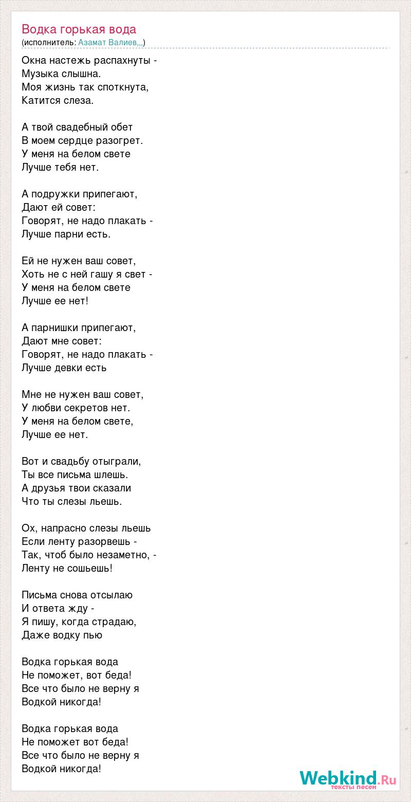 Окна настежь распахнуты - Музыка слышна. Моя жизнь так споткнута, Катится слеза. А твой свадебный обет В моем сердце разогрет. У меня на белом свете Лучше тебя нет. А подружки припегают, Дают ей совет: Говорят, не надо плакать - Лучше парни есть. Ей не нужен ваш совет, Хоть не с ней гашу я свет - У меня на белом свете Лучше ее нет! А парнишки припегают, Дают мне совет: Говорят, не надо плакать - Лучше девки есть Мне не нужен ваш совет, У любви секретов нет. У меня на белом свете, Лучше ее нет. Вот и свадьбу отыграли, Ты все письма шлешь. А друзья твои сказали Что ты слезы льешь. Ох, напрасно слезы льешь Если ленту разорвешь - Так, чтоб было незаметно, - Ленту не сошьешь! Письма снова отсылаю И ответа жду - Я пишу, когда страдаю, Даже водку пью Водка горькая вода Не поможет, вот беда! Все что было не верну я Водкой никогда! Водка горькая вода Не поможет вот беда! Все что было не верну я Водкой никогда!