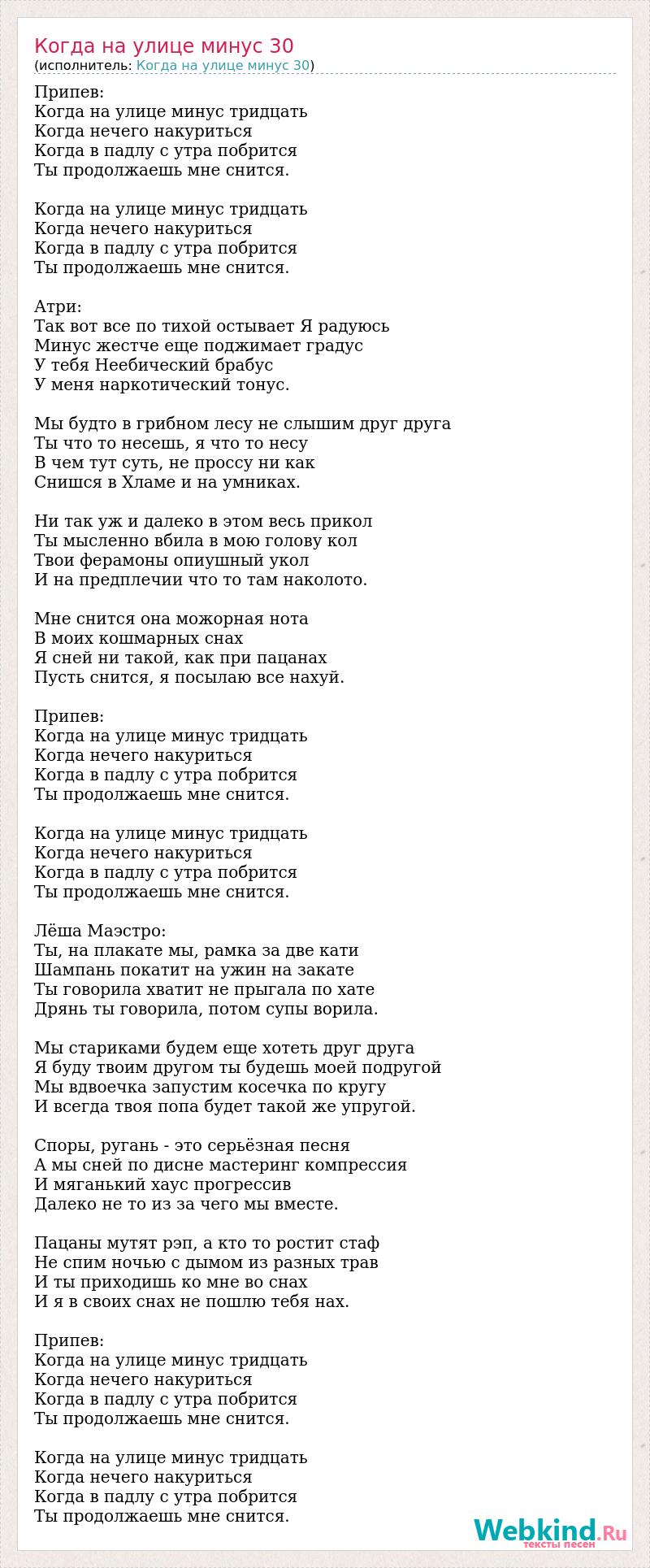 Припев: Когда на улице минус тридцать Когда нечего накуриться Когда в падлу с утра побрится Ты продолжаешь мне снится. Когда на улице минус тридцать Когда нечего накуриться Когда в падлу с утра побрится Ты продолжаешь мне снится. Атри: Так вот все по тихой остывает Я радуюсь Минус жестче еще поджимает градус У тебя Неебический брабус У меня наркотический тонус. Мы будто в грибном лесу не слышим друг друга Ты что то несешь, я что то несу В чем тут суть, не проссу ни как Снишся в Хламе и на умниках. Ни так уж и далеко в этом весь прикол Ты мысленно вбила в мою голову кол Твои ферамоны опиушный укол И на предплечии что то там наколото. Мне снится она можорная нота В моих кошмарных снах Я сней ни такой, как при пацанах Пусть снится, я посылаю все нахуй. Припев: Когда на улице минус тридцать Когда нечего накуриться Когда в падлу с утра побрится Ты продолжаешь мне снится. Когда на улице минус тридцать Когда нечего накуриться Когда в падлу с утра побрится Ты продолжаешь мне снится. Лёша Маэстро: Ты, на плакате мы, рамка за две кати Шампань покатит на ужин на закате Ты говорила хватит не прыгала по хате Дрянь ты говорила, потом супы ворила. Мы стариками будем еще хотеть друг друга Я буду твоим другом ты будешь моей подругой Мы вдвоечка запустим косечка по кругу И всегда твоя попа будет такой же упругой. Споры, ругань - это серьёзная песня А мы сней по дисне мастеринг компрессия И мяганький хаус прогрессив Далеко не то из за чего мы вместе. Пацаны мутят рэп, а кто то ростит стаф Не спим ночью с дымом из разных трав И ты приходишь ко мне во снах И я в своих снах не пошлю тебя нах. Припев: Когда на улице минус тридцать Когда нечего накуриться Когда в падлу с утра побрится Ты продолжаешь мне снится. Когда на улице минус тридцать Когда нечего накуриться Когда в падлу с утра побрится Ты продолжаешь мне снится.