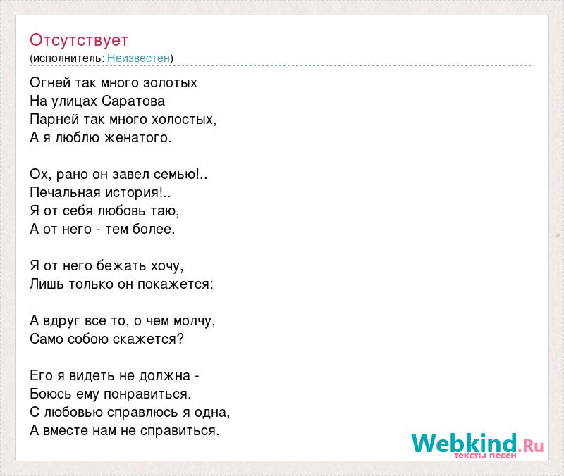 Огней так много золотых На улицах Саратова Парней так много холостых, А я люблю женатого. Ох, рано он завел семью!.. Печальная история!.. Я от себя любовь таю, А от него - тем более. Я от него бежать хочу, Лишь только он покажется: А вдруг все то, о чем молчу, Само собою скажется? Его я видеть не должна - Боюсь ему понравиться. С любовью справлюсь я одна, А вместе нам не справиться.