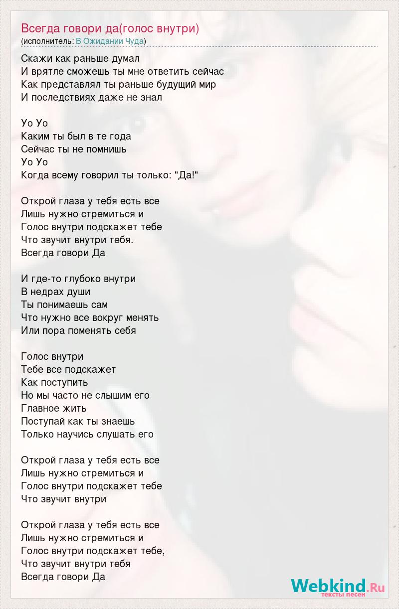 Скажи как раньше думал И врятле сможешь ты мне ответить сейчас Как представлял ты раньше будущий мир И последствиях даже не знал Уо Уо Каким ты был в те года Сейчас ты не помнишь Уо Уо Когда всему говорил ты только: "Да!" Открой глаза у тебя есть все Лишь нужно стремиться и Голос внутри подскажет тебе Что звучит внутри тебя. Всегда говори Да И где-то глубоко внутри В недрах души Ты понимаешь сам Что нужно все вокруг менять Или пора поменять себя Голос внутри Тебе все подскажет Как поступить Но мы часто не слышим его Главное жить Поступай как ты знаешь Только научись слушать его Открой глаза у тебя есть все Лишь нужно стремиться и Голос внутри подскажет тебе Что звучит внутри Открой глаза у тебя есть все Лишь нужно стремиться и Голос внутри подскажет тебе, Что звучит внутри тебя Всегда говори Да