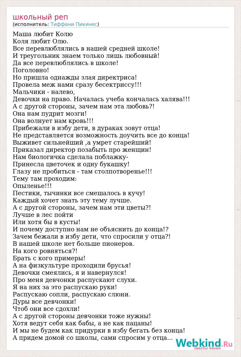 Маша любит Колю Коля любит Олю. Все перевлюблялись в нашей средней школе! И треугольник знаем только лишь любовный! Да все перевлюблялись в школе! Поголовно! Но пришла однажды злая директриса! Провела меж нами сразу бесектриссу!!! Мальчики - налево, Девочки на право. Началась учеба кончалась халява!!! А с другой стороны, зачем нам эта любовь?! Она нам пудрит мозги! Она волнует нам кровь!!! Прибежали в избу дети, в дураках зовут отца! Не представляется возможность доучить все до конца! Выживет сильнейший ,а умрет старейший! Приказал директор позабыть про женщин! Нам биологичка сделала поблажку- Принесла цветочек и одну букашку! Глазу не пробиться - там столпотворенье!!! Тему там проходим: Опыленье!!! Пестики, тычинки все смешалось в кучу! Каждый хочет знать эту тему лучше. А с другой стороны, зачем нам эти цветы?! Лучше в лес пойти Или хотя бы в кусты! И почему доступно нам не объяснить до конца!? Зачем бежали в избу дети, что спросили у отца?! В нашей школе нет больше пионеров. На кого ровняться?! Брать с кого примеры! А на физкультуре проходили брусья! Девочки смеялись, я и навернулся! Про меня девчонки распускают слухи. Я на них за это распускаю руки! Распускаю сопли, распускаю слюни. Дуры все девчонки! Чтоб они все сдохли! А с другой стороны девчонки тоже нужны! Хотя ведут себя как бабы, а не как пацаны! И мы не будем как придурки в избу бегать без конца! А придем домой со школы, сами спросим у отца...