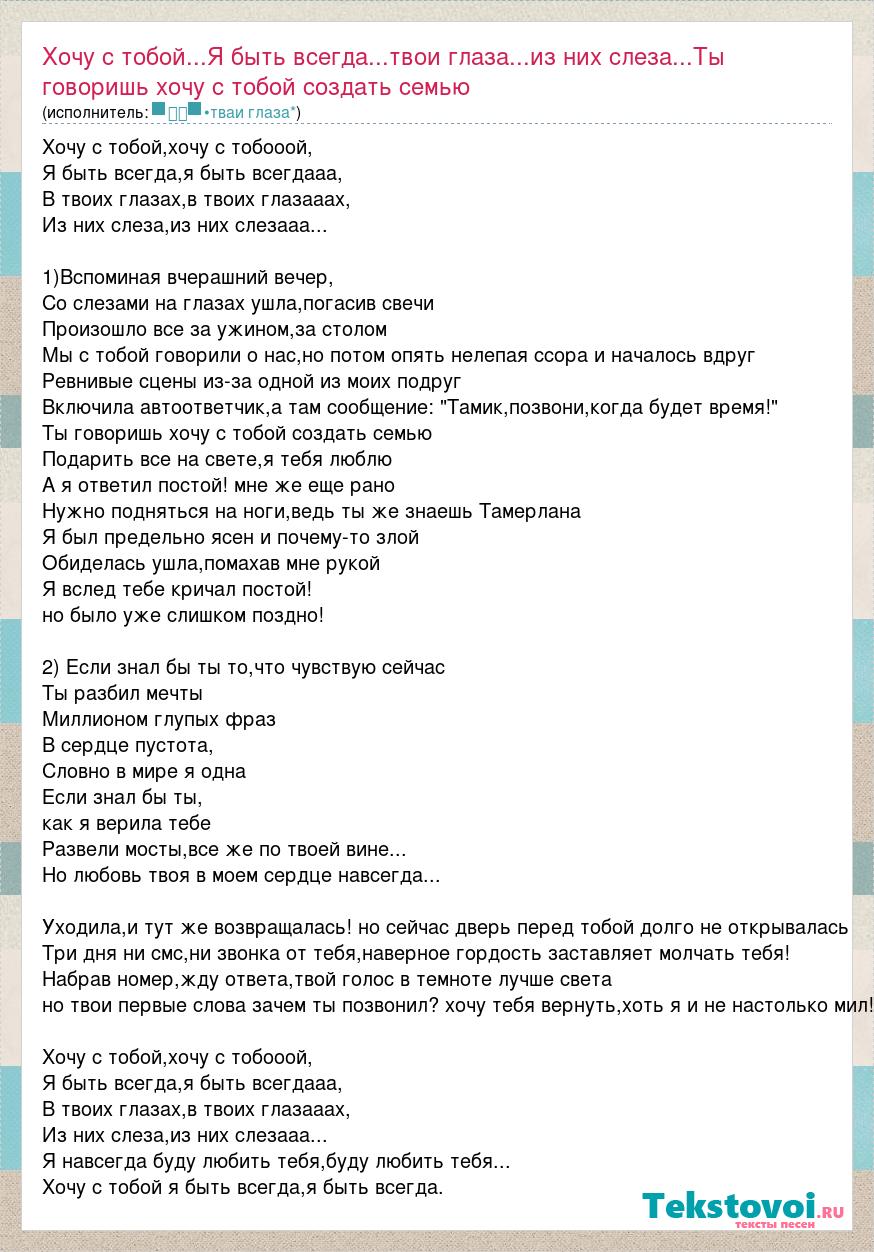 Хочу с тобой,хочу с тобооой, Я быть всегда,я быть всегдааа, В твоих глазах,в твоих глазааах, Из них слеза,из них слезааа... 1)Вспоминая вчерашний вечер, Со слезами на глазах ушла,погасив свечи Произошло все за ужином,за столом Мы с тобой говорили о нас,но потом опять нелепая ссора и началось вдруг Ревнивые сцены из-за одной из моих подруг Включила автоответчик,а там сообщение: "Тамик,позвони,когда будет время!" Ты говоришь хочу с тобой создать семью Подарить все на свете,я тебя люблю А я ответил постой! мне же еще рано Нужно подняться на ноги,ведь ты же знаешь Тамерлана Я был предельно ясен и почему-то злой Обиделась ушла,помахав мне рукой Я вслед тебе кричал постой! но было уже слишком поздно! 2) Если знал бы ты то,что чувствую сейчас Ты разбил мечты Миллионом глупых фраз В сердце пустота, Словно в мире я одна Если знал бы ты, как я верила тебе Развели мосты,все же по твоей вине... Но любовь твоя в моем сердце навсегда... Уходила,и тут же возвращалась! но сейчас дверь перед тобой долго не открывалась Три дня ни смс,ни звонка от тебя,наверное гордость заставляет молчать тебя! Набрав номер,жду ответа,твой голос в темноте лучше света но твои первые слова зачем ты позвонил? хочу тебя вернуть,хоть я и не настолько мил! Хочу с тобой,хочу с тобооой, Я быть всегда,я быть всегдааа, В твоих глазах,в твоих глазааах, Из них слеза,из них слезааа... Я навсегда буду любить тебя,буду любить тебя... Хочу с тобой я быть всегда,я быть всегда.