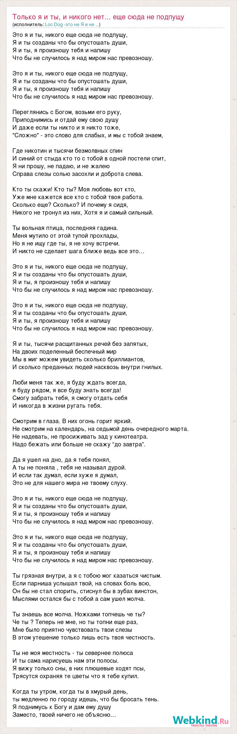 Это я и ты, никого еще сюда не подпущу, Я и ты созданы что бы опустошать души, Я и ты, я произношу тебя и напишу Что бы не случилось я над миром нас превозношу. Это я и ты, никого еще сюда не подпущу, Я и ты созданы что бы опустошать души, Я и ты, я произношу тебя и напишу Что бы не случилось я над миром нас превозношу. Переглянись с Богом, возьми его руку, Приподнимись и отдай ему свою душу И даже если ты никто и я никто тоже, "Сложно" - это слово для слабых, и мы с тобой знаем, Где никотин и тысячи безмолвных спин И синий от стыда кто то с тобой в одной постели спит, Я ни прошу, не падаю, и не жалею Справа слезы солью засохли и доброта слева. Кто ты скажи! Кто ты? Моя любовь вот кто, Уже мне кажется все кто с тобой твоя работа. Сколько еще? Сколько? И почему я сидя, Никого не тронул из них, Хотя я и самый сильный. Ты вольная птица, последняя гадина. Меня мутило от этой тупой прохлады, Но я не ищу где ты, я не хочу встречи. И никто не сделает шага ближе ведь все это… Это я и ты, никого еще сюда не подпущу, Я и ты созданы что бы опустошать души, Я и ты, я произношу тебя и напишу Что бы не случилось я над миром нас превозношу. Это я и ты, никого еще сюда не подпущу, Я и ты созданы что бы опустошать души, Я и ты, я произношу тебя и напишу Что бы не случилось я над миром нас превозношу. Я и ты, тысячи расщитанных речей без запятых, На двоих поделенный беспечный мир Мы в миг можем увидеть сколько бриллиантов, И сколько преданных людей насквозь внутри гнилых. Люби меня так же, я буду ждать всегда, я буду рядом, я все буду знать всегда! Смогу забрать тебя, я смогу отдать себя И никогда в жизни ругать тебя. Смотрим в глаза. В них огонь горит яркий. Не смотрим на календарь, на седьмой день очередного марта. Не надевать, не просиживать зад у кинотеатра. Надо бежать или больше не скажу “до завтра”. Да я ушел на дно, да я тебя понял, А ты не поняла , тебя не называл дурой. И если так думал, если хуже я думал, Это не для нашего мира не твоему слуху. Это я и ты, никого еще сюда не подпущу, Я и ты созданы что бы опустошать души, Я и ты, я произношу тебя и напишу Что бы не случилось я над миром нас превозношу. Это я и ты, никого еще сюда не подпущу, Я и ты созданы что бы опустошать души, Я и ты, я произношу тебя и напишу Что бы не случилось я над миром нас превозношу. Ты грязная внутри, а я с тобою мог казаться чистым. Если парниша услышал твой, на словах боль всю, Он бы не стал спорить, стиснул бы в зубах винстон, Мыслями остался бы с тобой а сам ушел молча. Ты знаешь все молча. Ножками топчешь че ты? Че ты ? Теперь не мне, но ты топни еще раз, Мне было приятно чувствовать твои слезы В этом утешение только лишь есть твоя честность. Ты не моя местность - ты севернее полюса И ты сама нарисуешь нам эти полосы. Я вижу только сны, в них плюшевые ходят псы, Трясутся охраняя те цветы что я тебе купил. Когда ты утром, когда ты в хмурый день, ты медленно по городу идешь, что бы бросать тень. Я поднимусь к Богу и дам ему душу Заместо, твоей ничего не объясню…